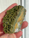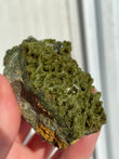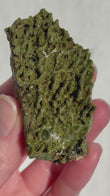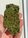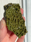 Typically dark green to blackish-green, Epidote forms in prismatic crystals or raw clusters with a vitreous luster. Some pieces display moss-like patterns and shimmering surfaces.