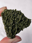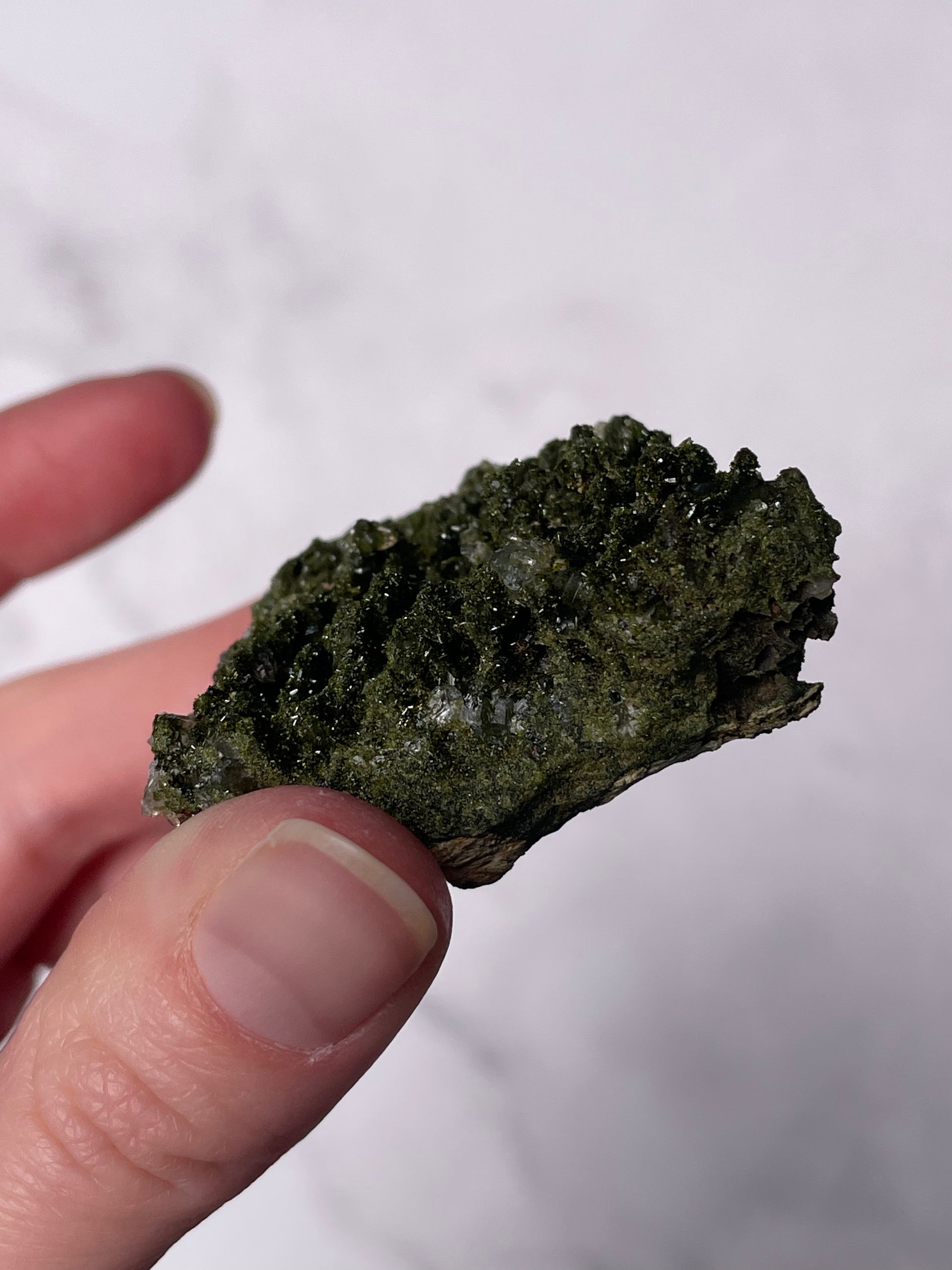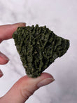 Typically dark green to blackish-green, Epidote forms in prismatic crystals or raw clusters with a vitreous luster. Some pieces display moss-like patterns and shimmering surfaces.