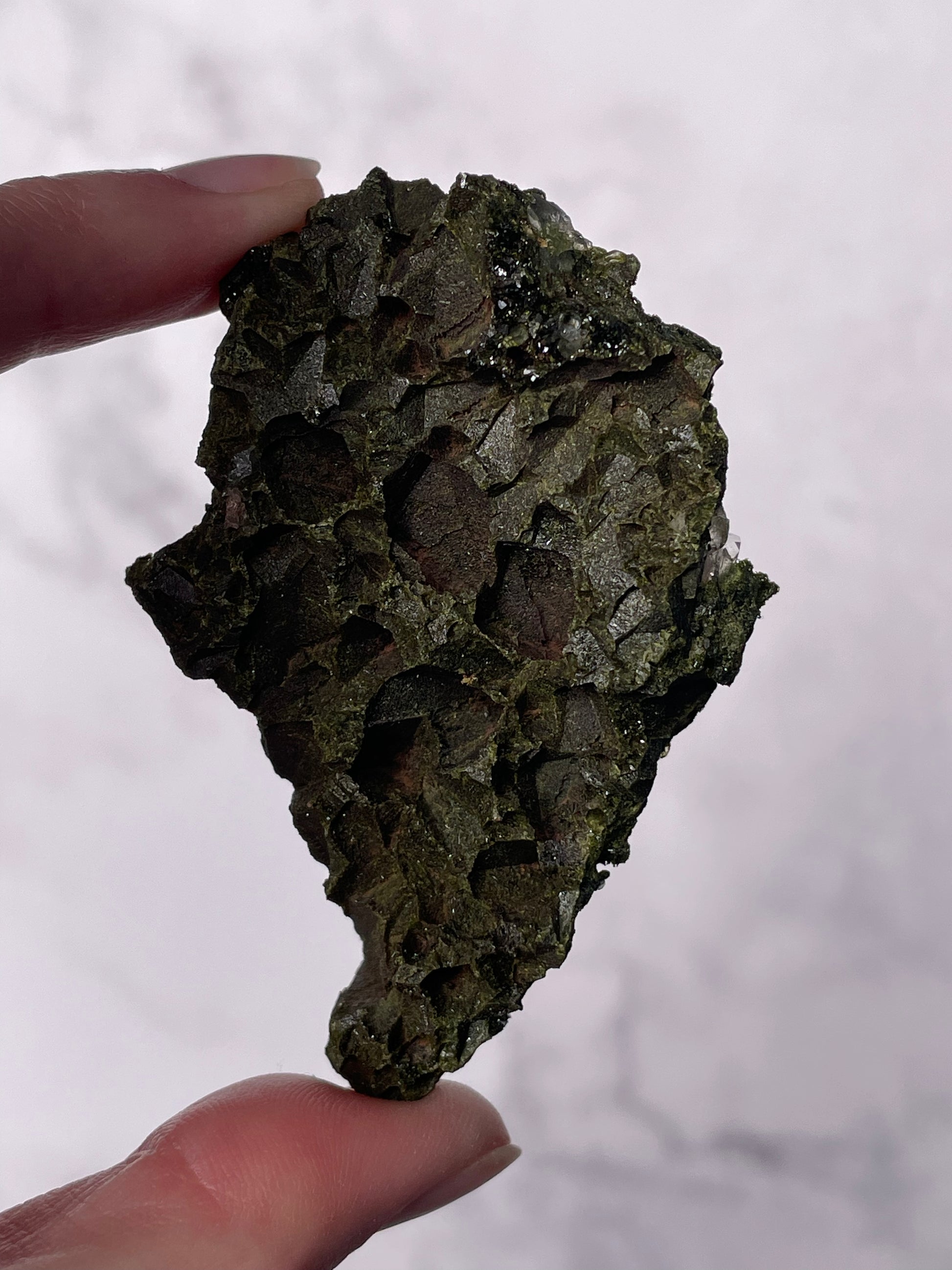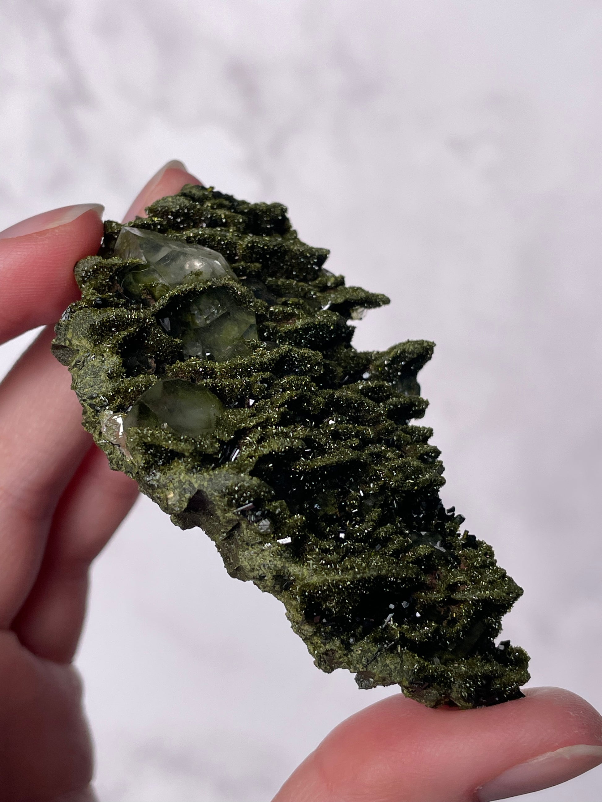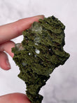 Typically dark green to blackish-green, Epidote forms in prismatic crystals or raw clusters with a vitreous luster. Some pieces display moss-like patterns and shimmering surfaces.