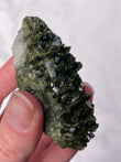 Typically dark green to blackish-green, Epidote forms in prismatic crystals or raw clusters with a vitreous luster. Some pieces display moss-like patterns and shimmering surfaces.