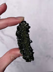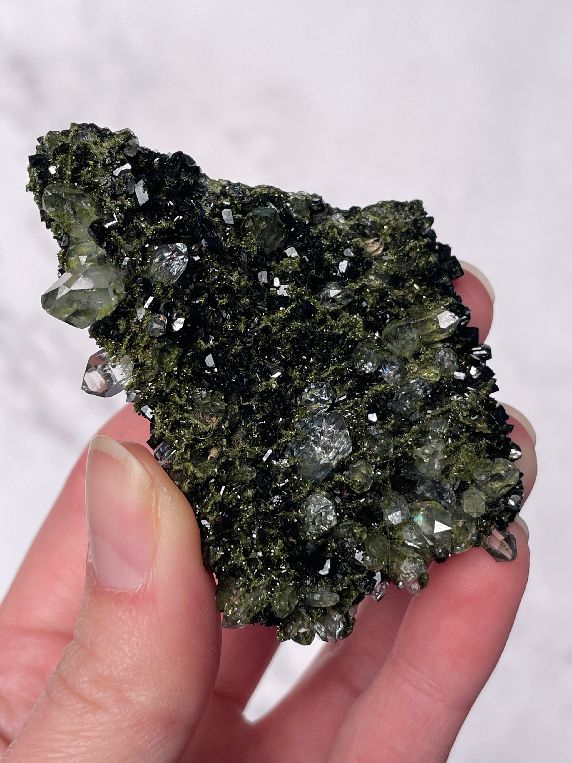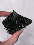 Typically dark green to blackish-green, Epidote forms in prismatic crystals or raw clusters with a vitreous luster. Some pieces display moss-like patterns and shimmering surfaces.
