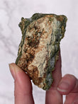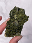 Typically dark green to blackish-green, Epidote forms in prismatic crystals or raw clusters with a vitreous luster. Some pieces display moss-like patterns and shimmering surfaces.