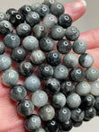 Polished 8 mm beads in deep blue-grey tones with chatoyant shimmer.