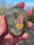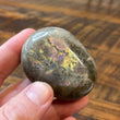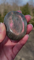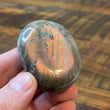 Iridescent flashes of blue, green, gold, and violet known as “labradorescence.” Polished into cabochons, towers, or palm stones.