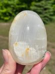 Clean with warm water and dry well. Avoid harsh cleaners. Cleansing methods: recharge under moonlight, smudging, or selenite plate charging.