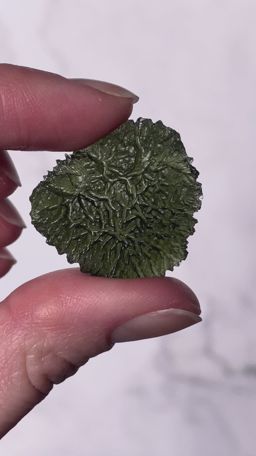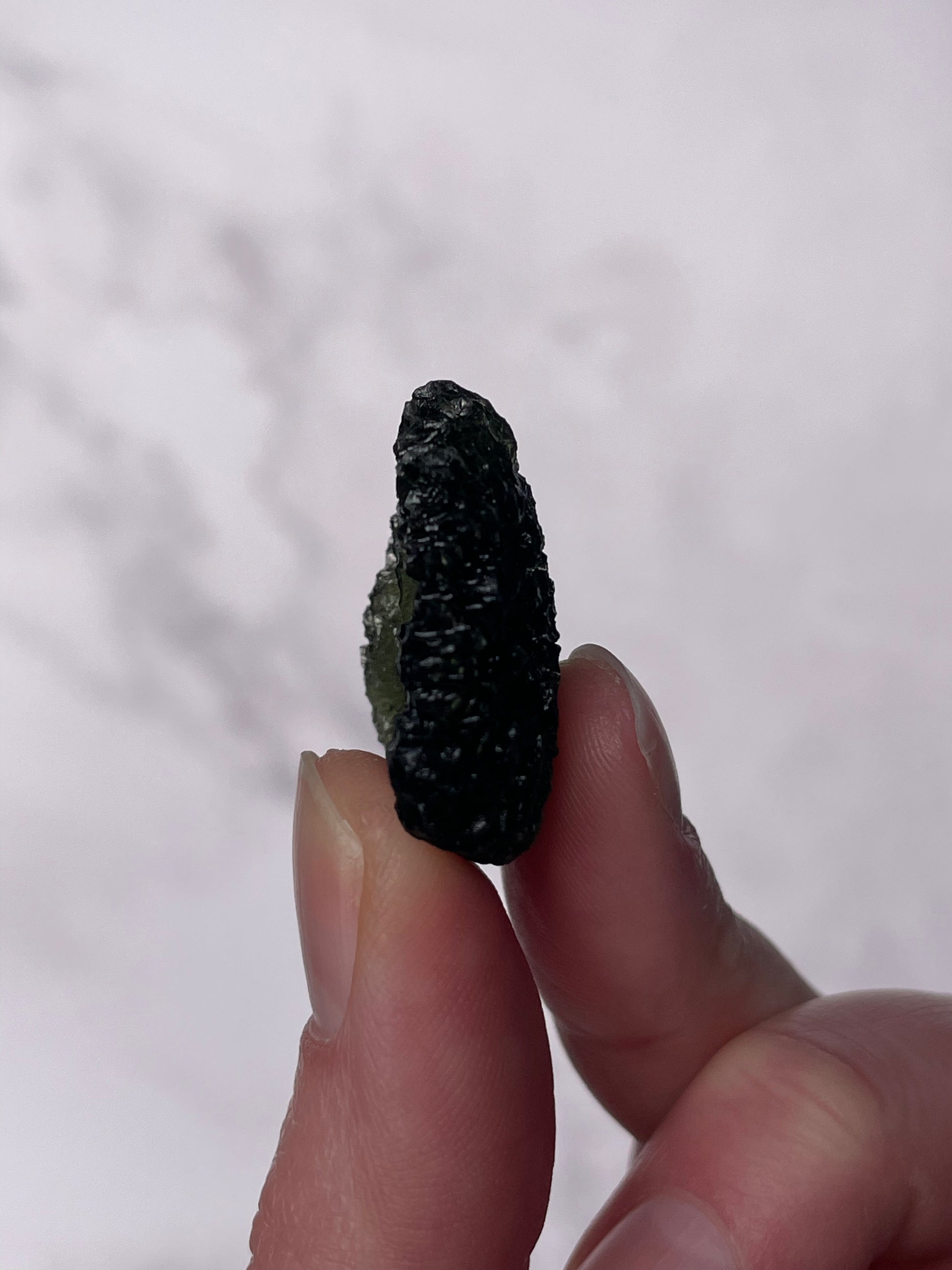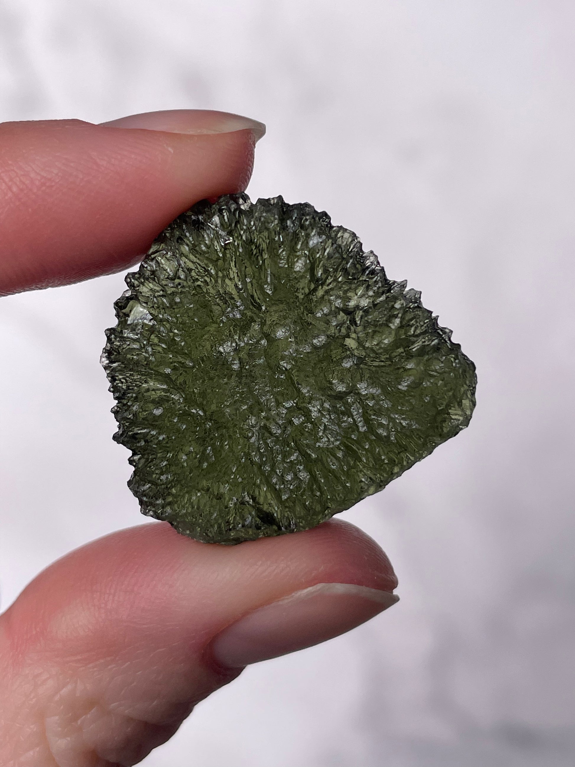 Typically olive to forest green with pronounced surface sculpting and natural grooves. Pieces often show translucent edges with a raw, aerodynamic form unique to authentic Moldavite.
