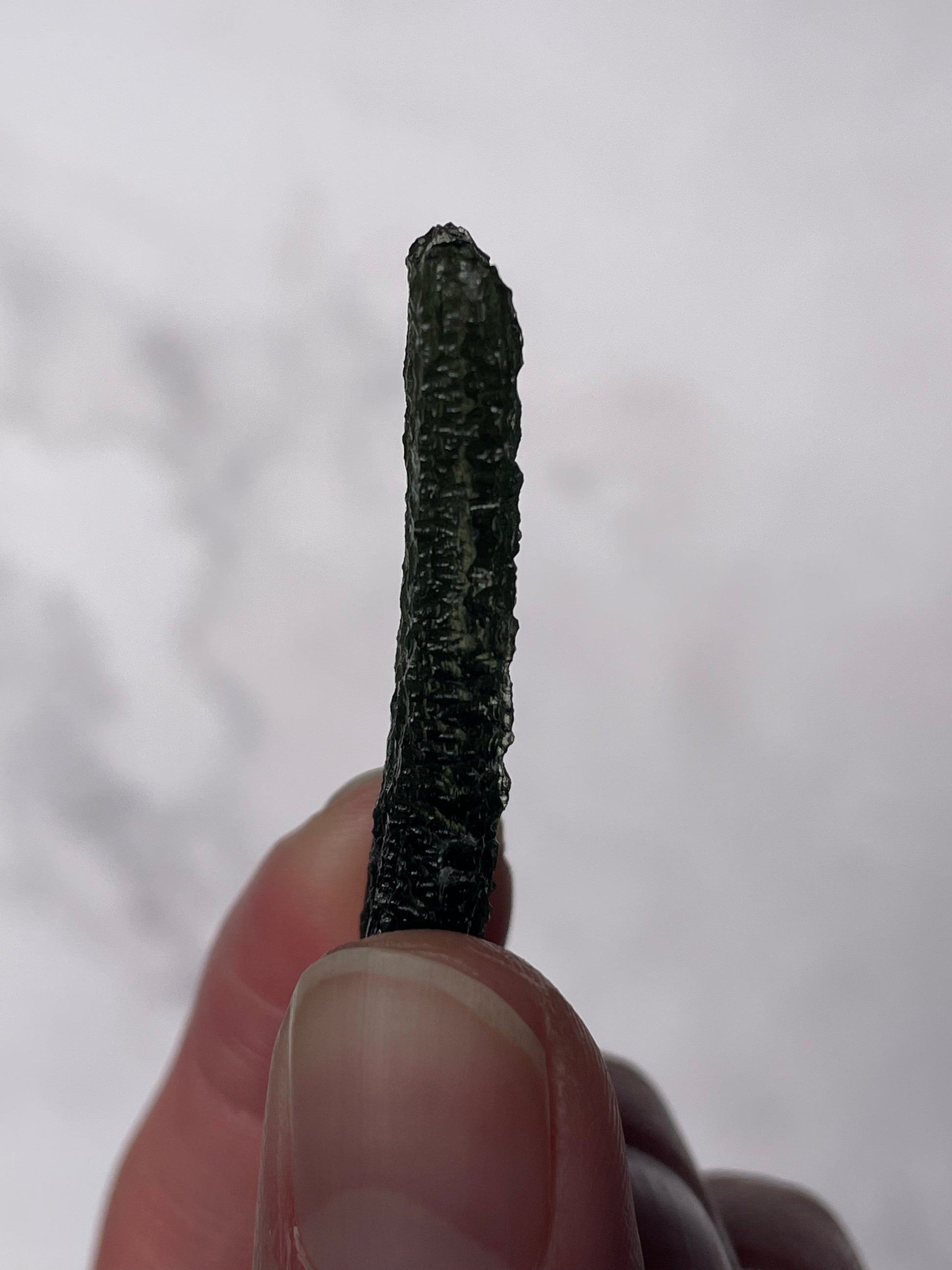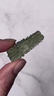Typically olive to forest green with pronounced surface sculpting and natural grooves. Pieces often show translucent edges with a raw, aerodynamic form unique to authentic Moldavite.