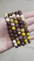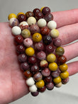 Polished 8 mm beads in a warm palette of reds, yellows, creams, and purples with natural marbling.