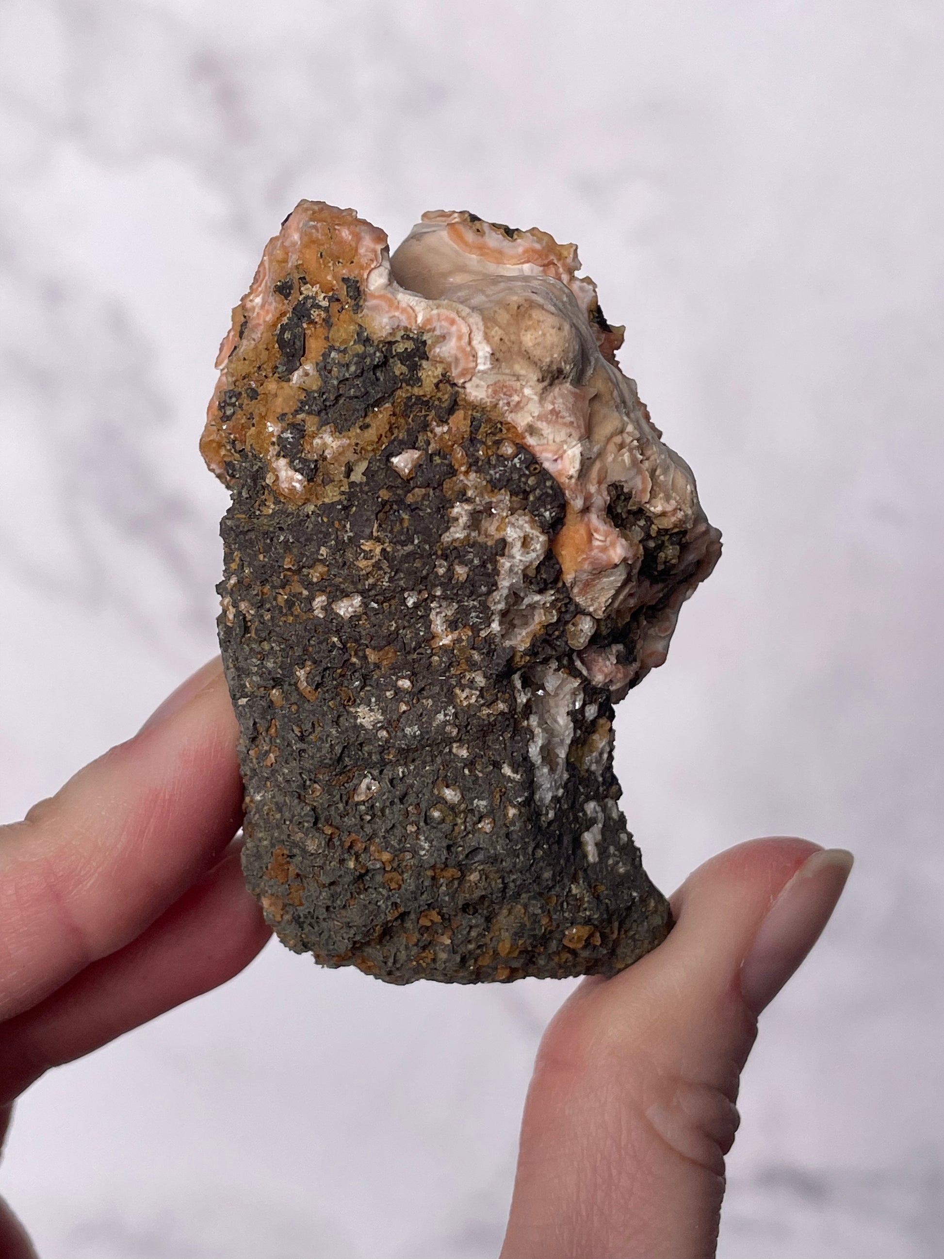 Sourced from India, Orange Thomsonite forms within volcanic basalt alongside other zeolite minerals. Indian Thomsonite is valued for its rarity, grounding energy, and heart-centered healing properties.
