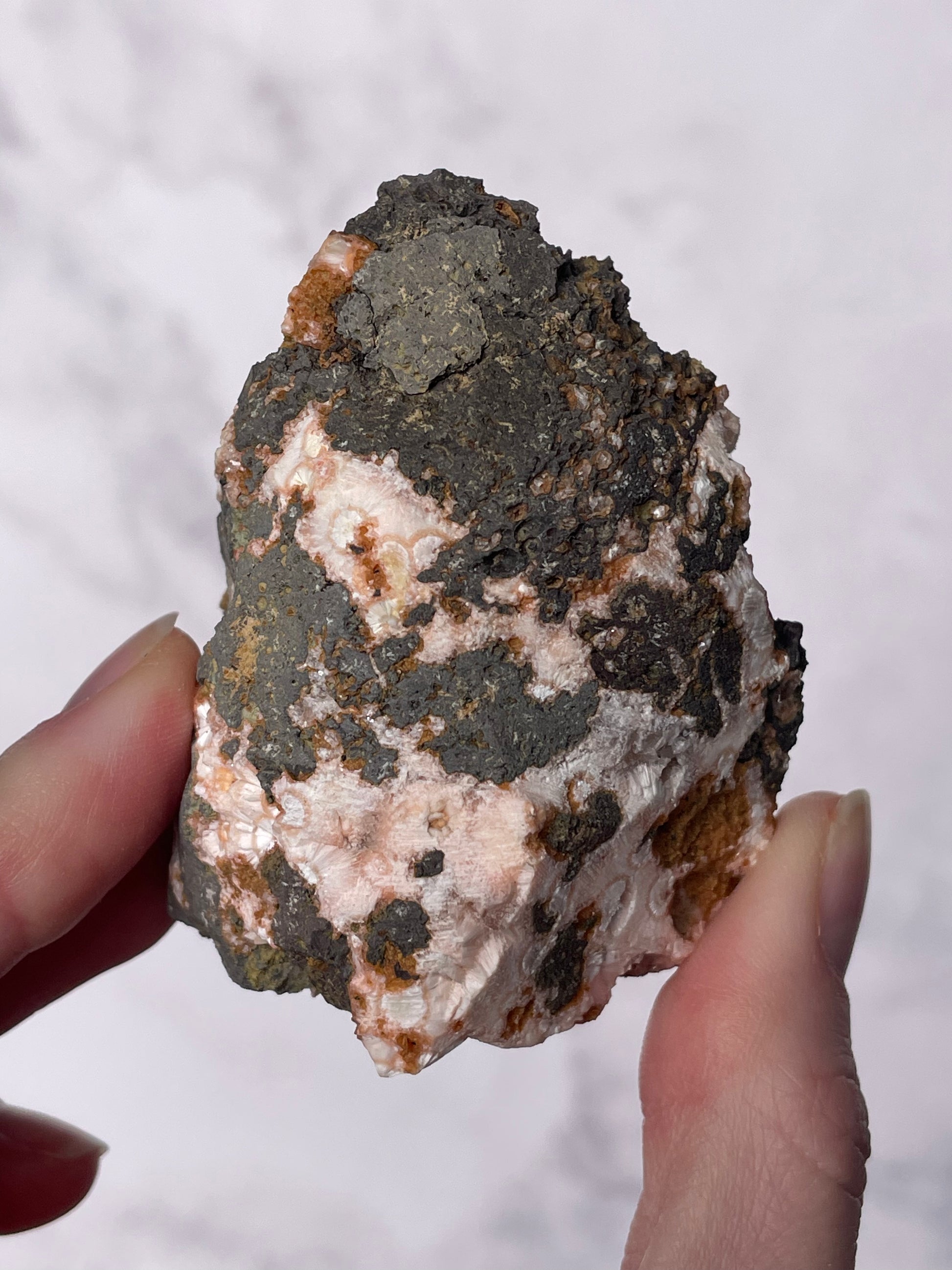Sourced from India, Orange Thomsonite forms within volcanic basalt alongside other zeolite minerals. Indian Thomsonite is valued for its rarity, grounding energy, and heart-centered healing properties.
