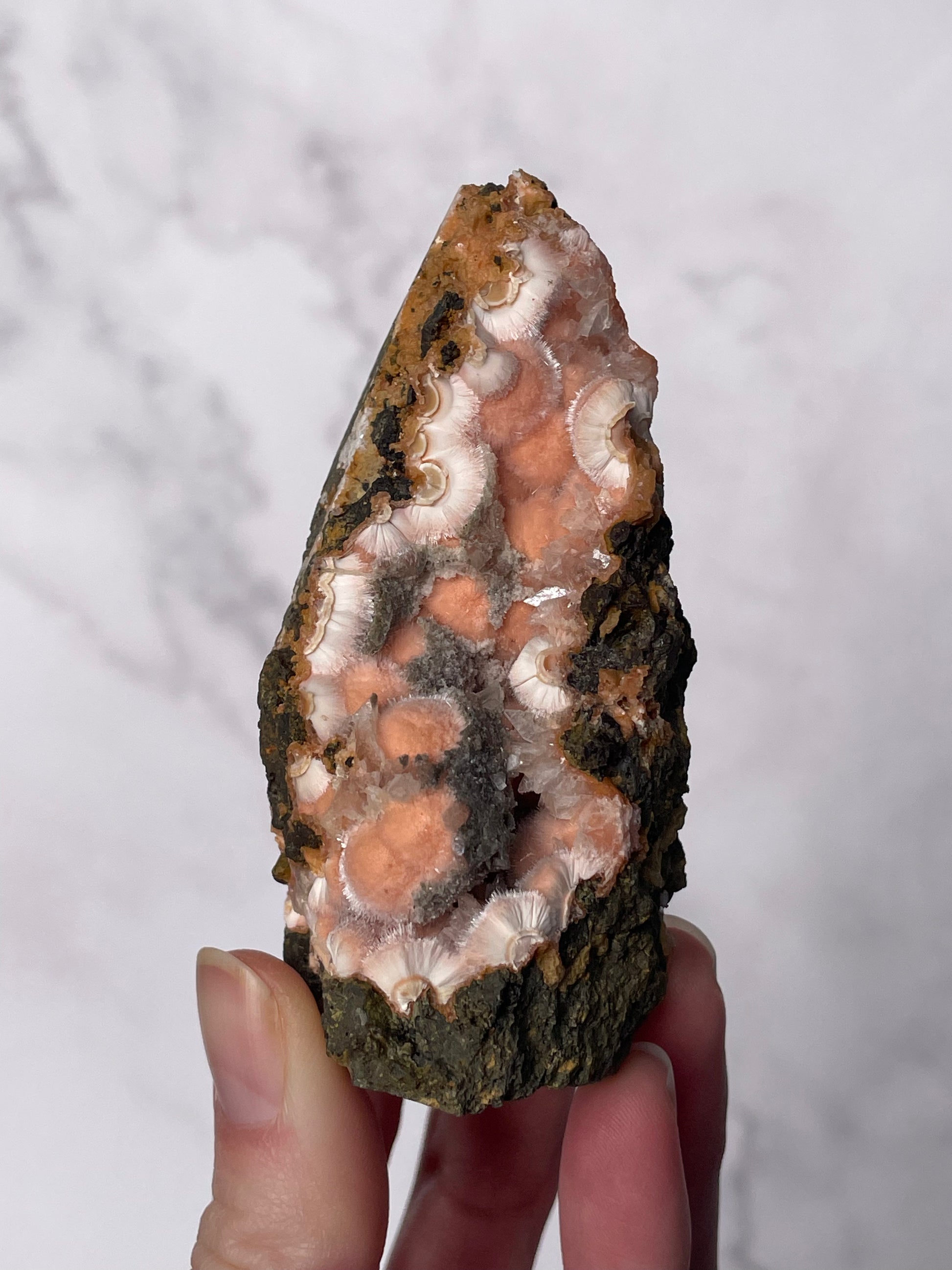 Sourced from India, Orange Thomsonite forms within volcanic basalt alongside other zeolite minerals. Indian Thomsonite is valued for its rarity, grounding energy, and heart-centered healing properties.