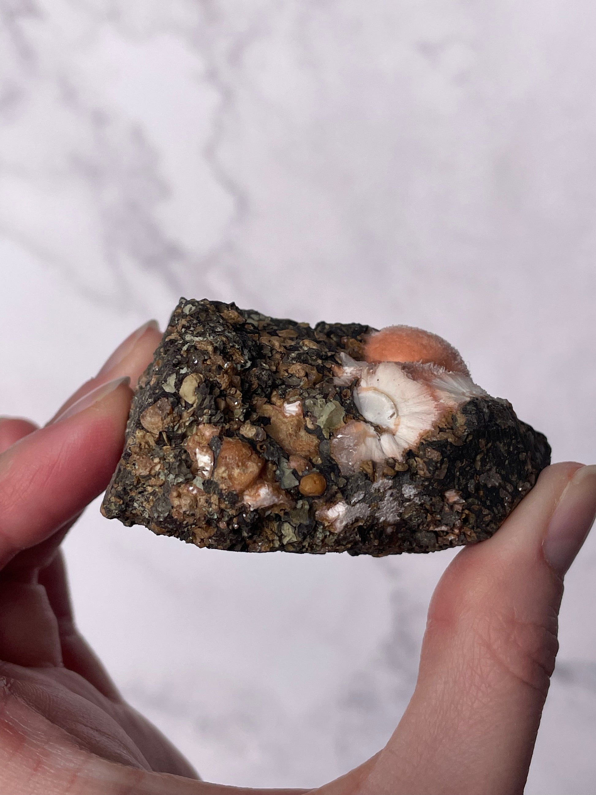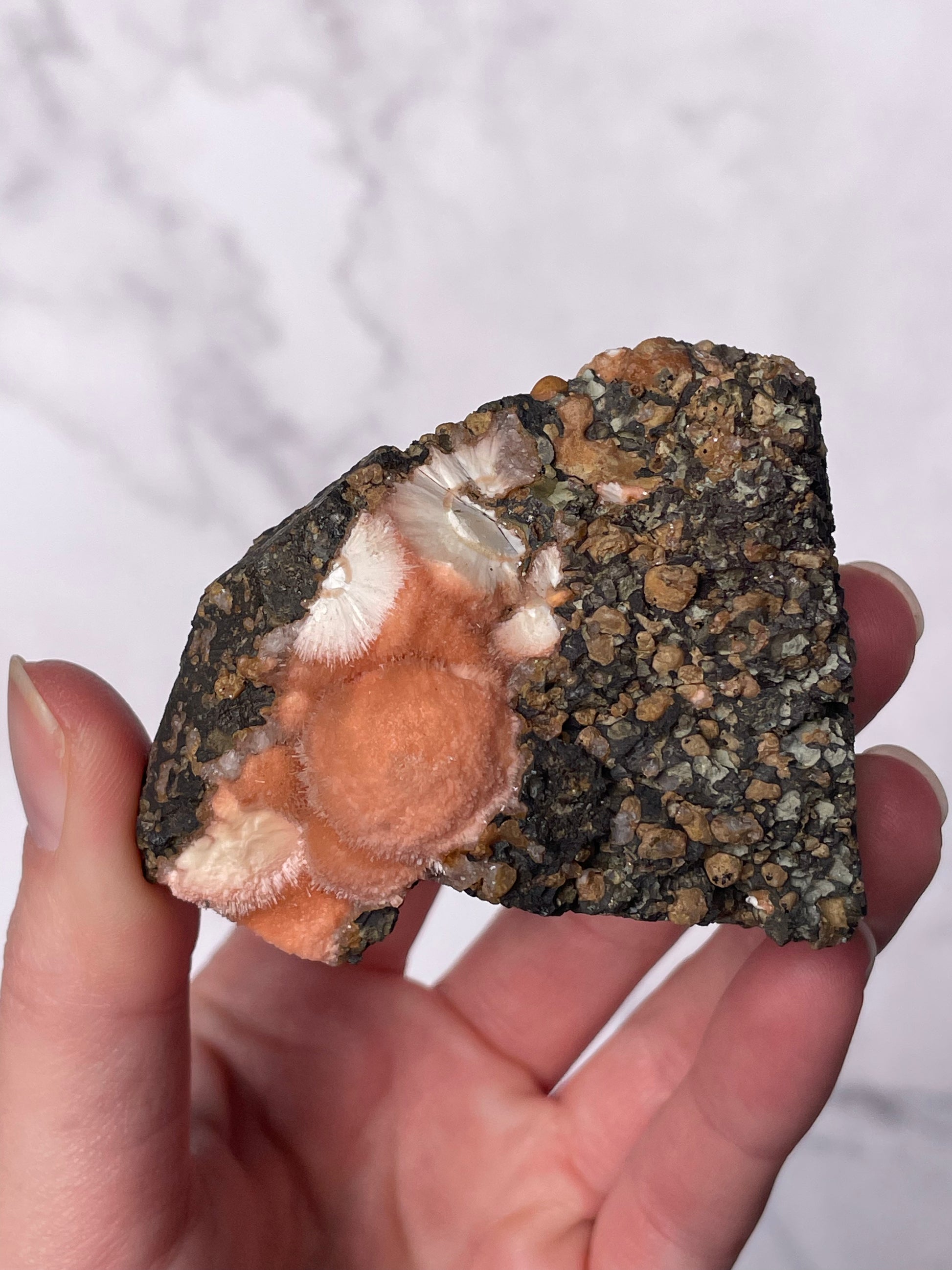 Sourced from India, Orange Thomsonite forms within volcanic basalt alongside other zeolite minerals. Indian Thomsonite is valued for its rarity, grounding energy, and heart-centered healing properties.
