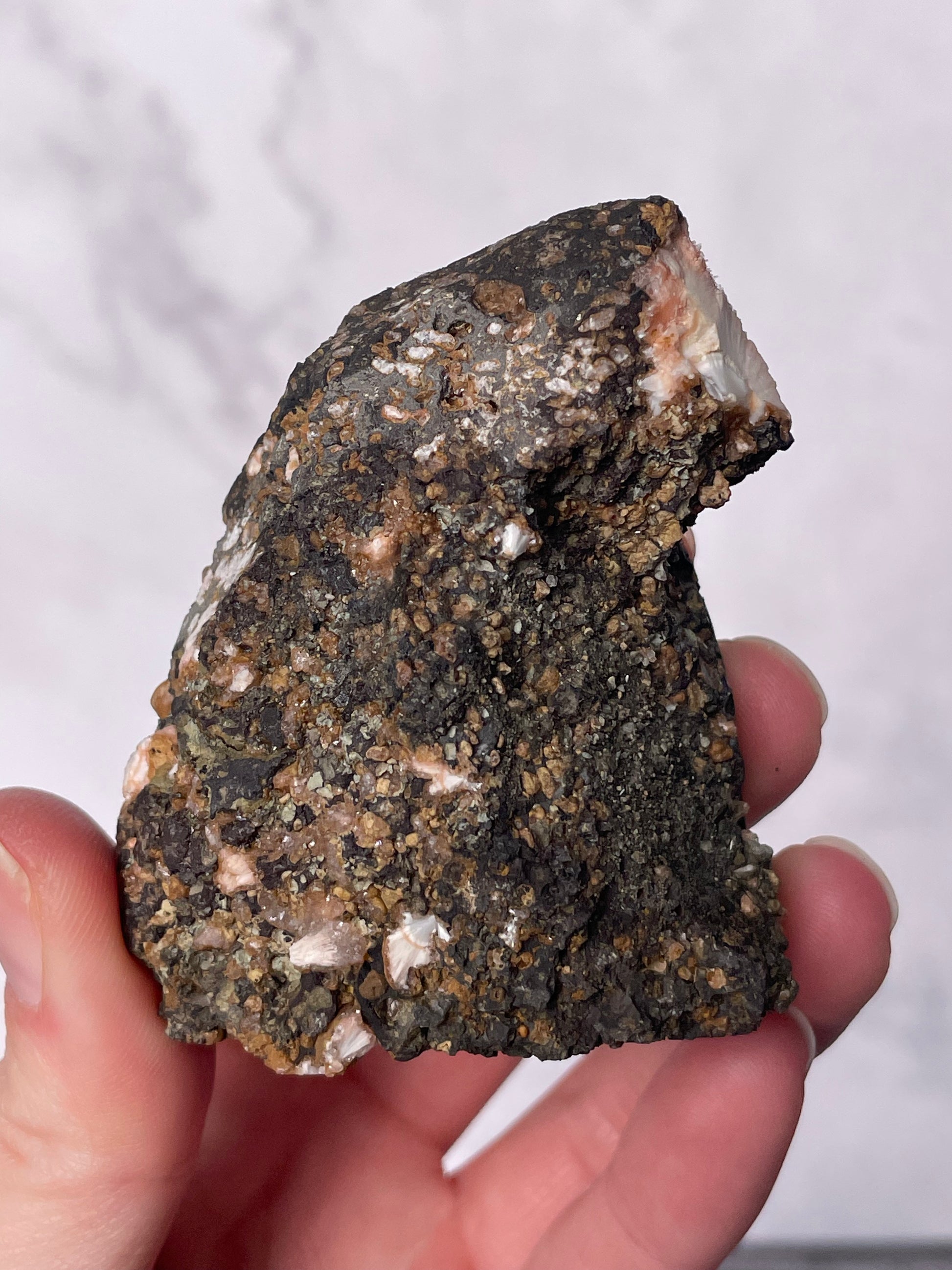 Handle with care as Thomsonite is a delicate zeolite mineral. Avoid water, salt, and harsh chemicals.