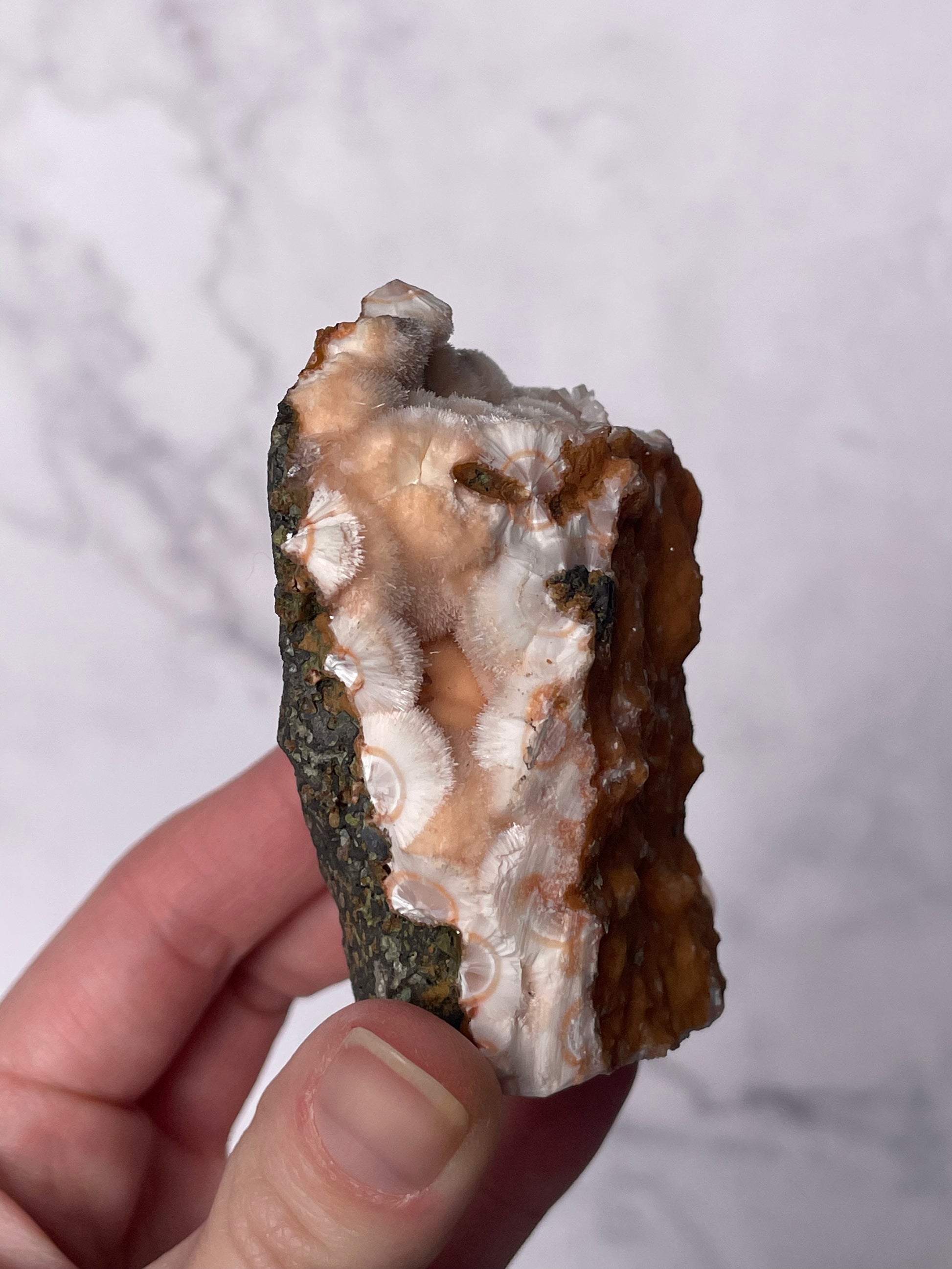 Sourced from India, Orange Thomsonite forms within volcanic basalt alongside other zeolite minerals. Indian Thomsonite is valued for its rarity, grounding energy, and heart-centered healing properties.