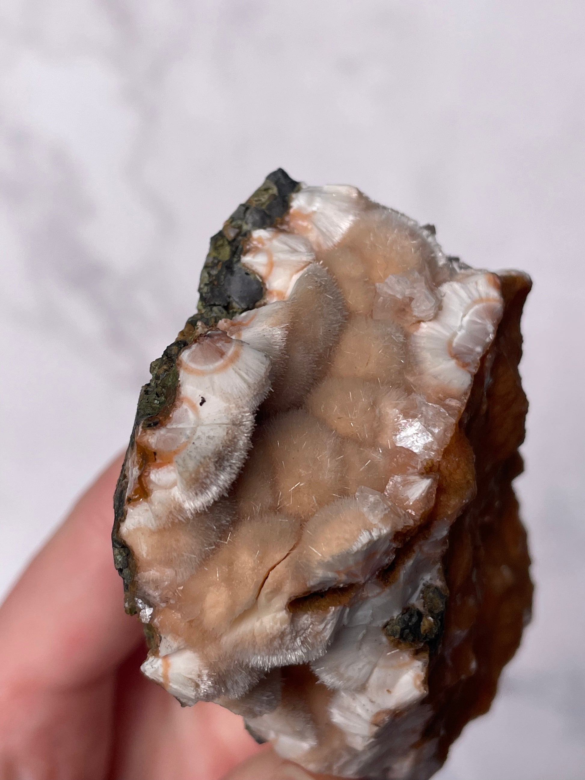 Handle with care as Thomsonite is a delicate zeolite mineral. Avoid water, salt, and harsh chemicals.