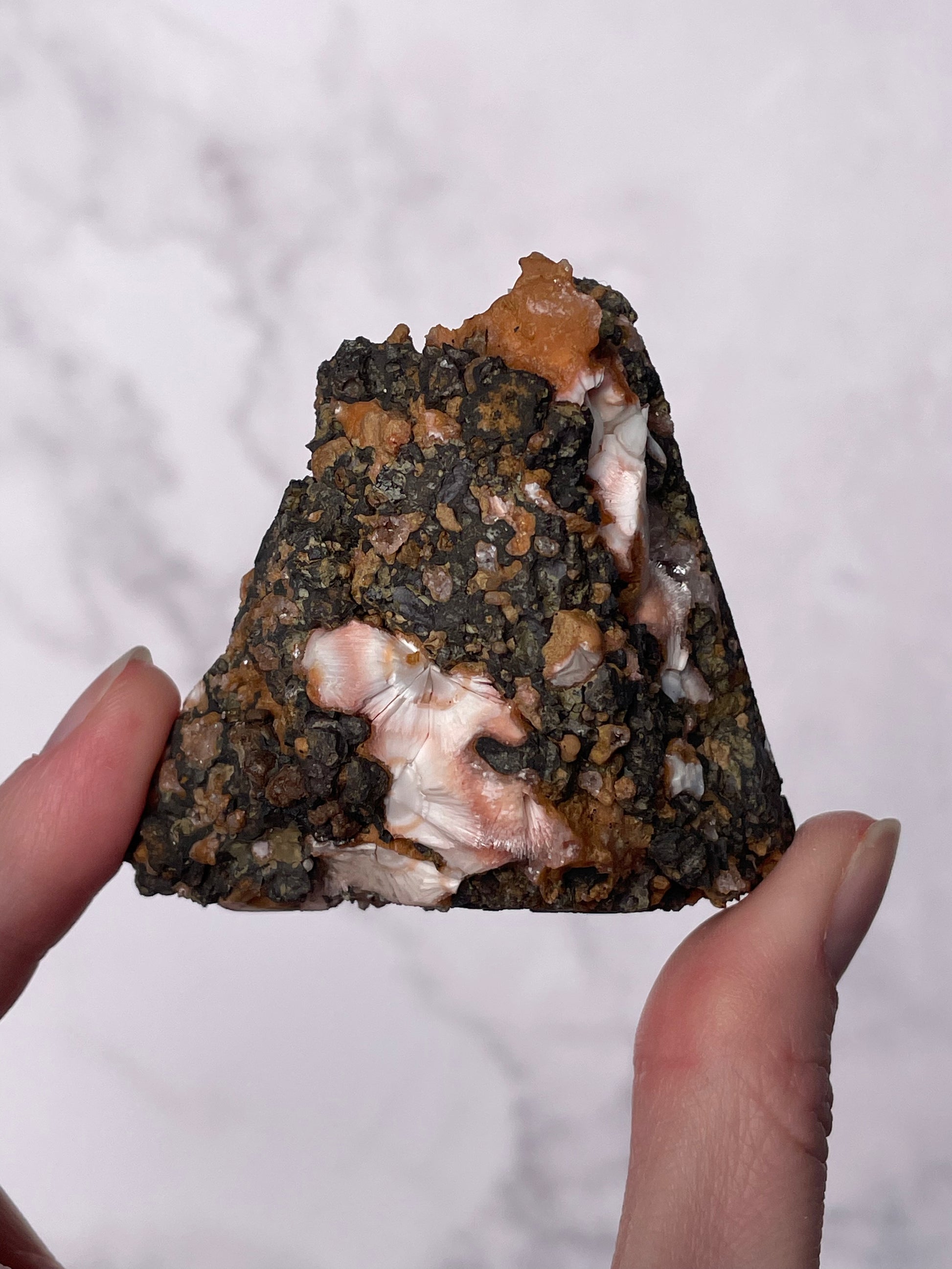 Sourced from India, Orange Thomsonite forms within volcanic basalt alongside other zeolite minerals. Indian Thomsonite is valued for its rarity, grounding energy, and heart-centered healing properties.