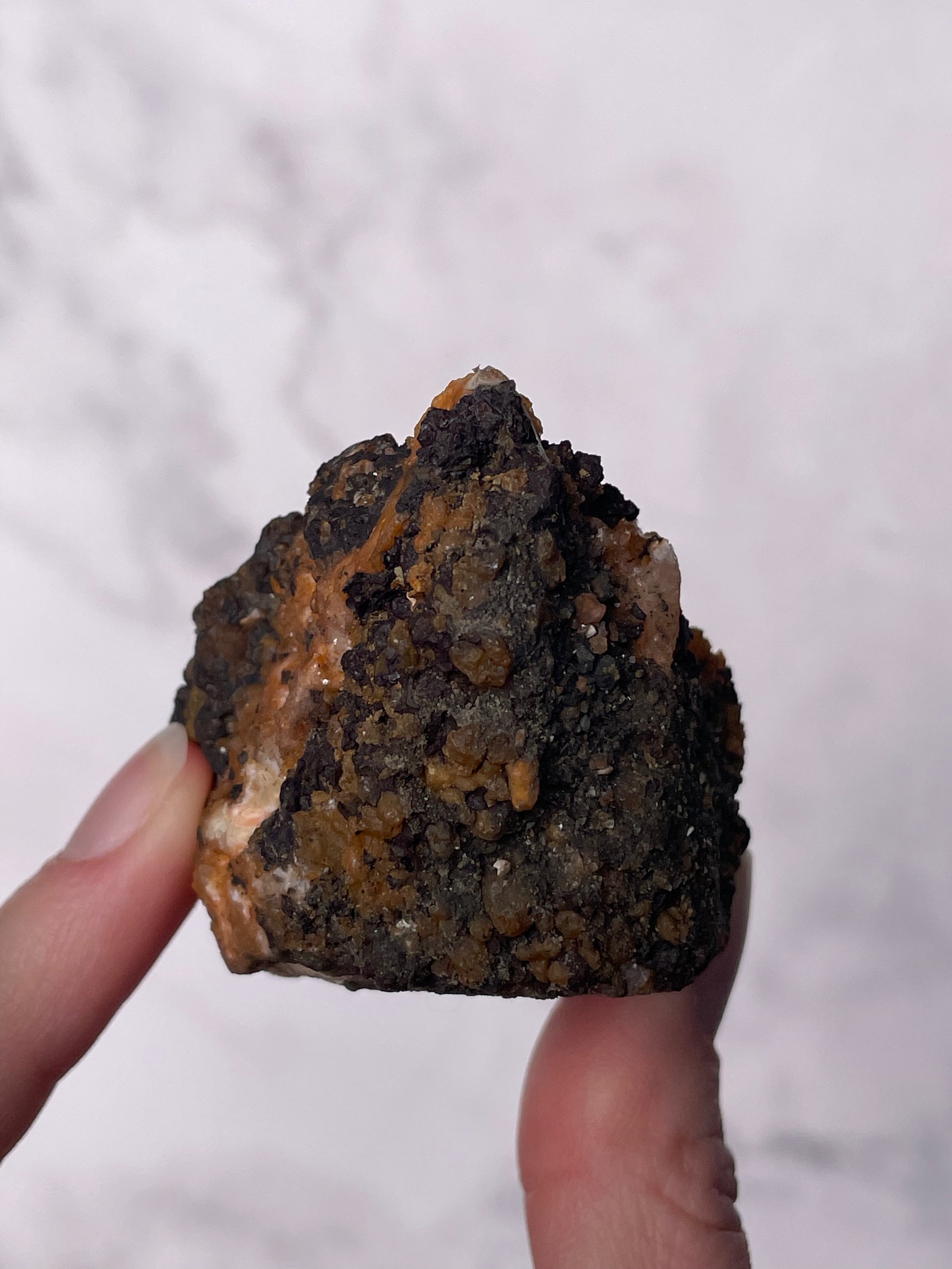Sourced from India, Orange Thomsonite forms within volcanic basalt alongside other zeolite minerals. Indian Thomsonite is valued for its rarity, grounding energy, and heart-centered healing properties.