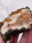 Displays warm peach to orange tones with creamy white zeolite formations. Pieces often show botryoidal textures, soft crystal sprays, and natural matrix contrast, making each specimen visually unique.