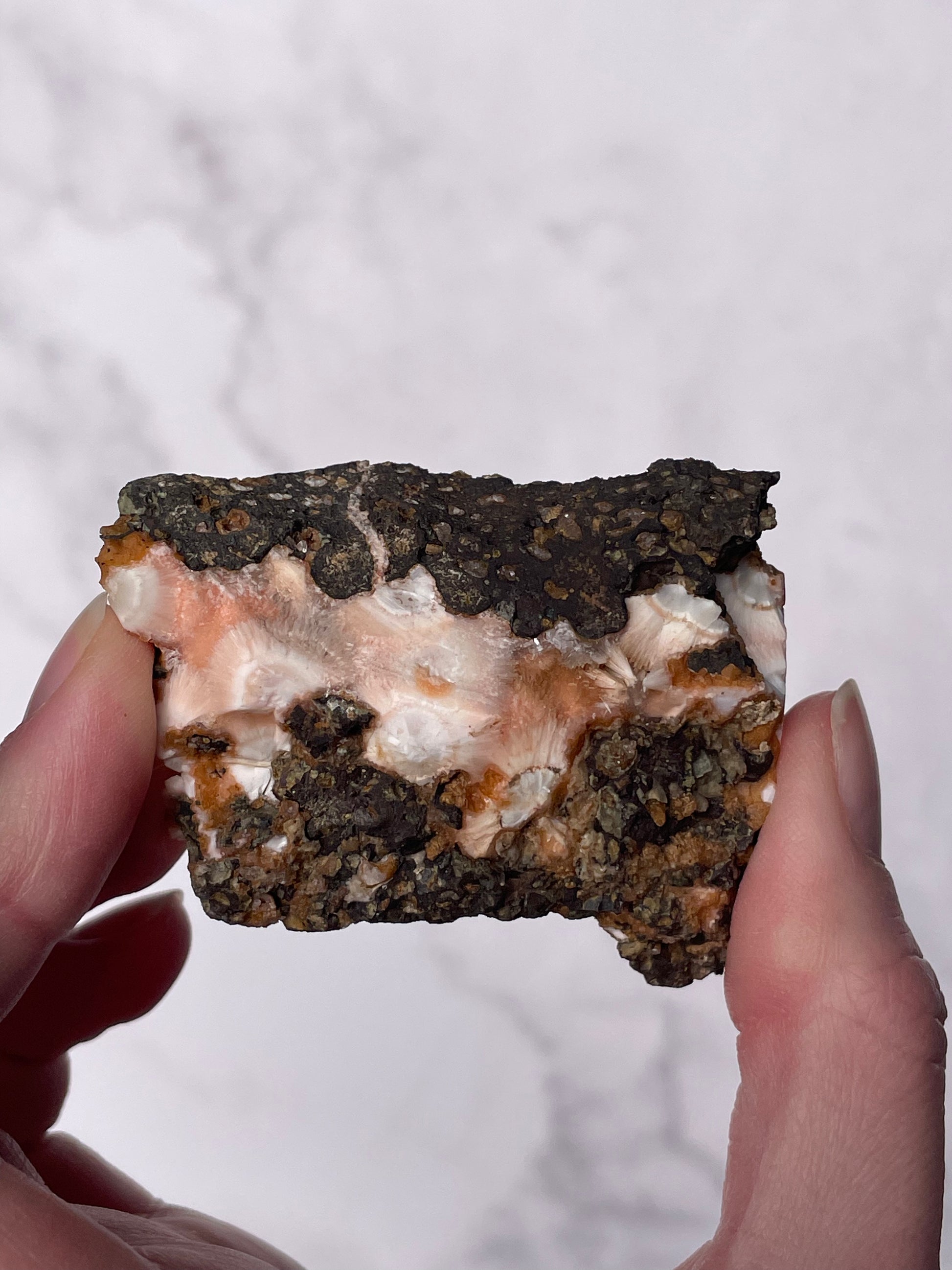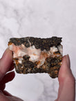 Sourced from India, Orange Thomsonite forms within volcanic basalt alongside other zeolite minerals. Indian Thomsonite is valued for its rarity, grounding energy, and heart-centered healing properties.