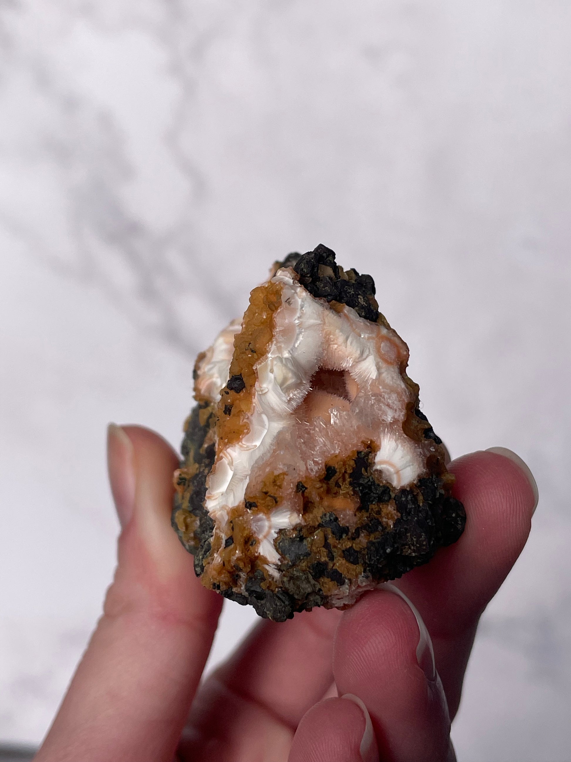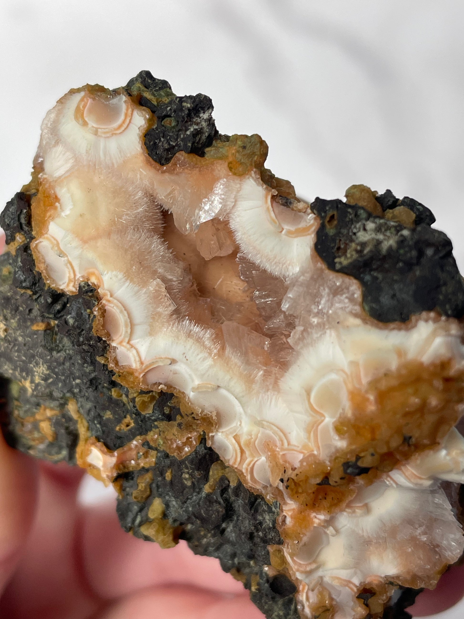 Sourced from India, Orange Thomsonite forms within volcanic basalt alongside other zeolite minerals. Indian Thomsonite is valued for its rarity, grounding energy, and heart-centered healing properties.