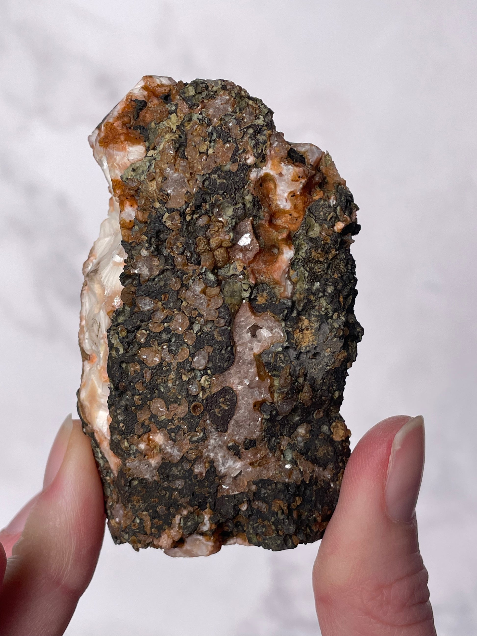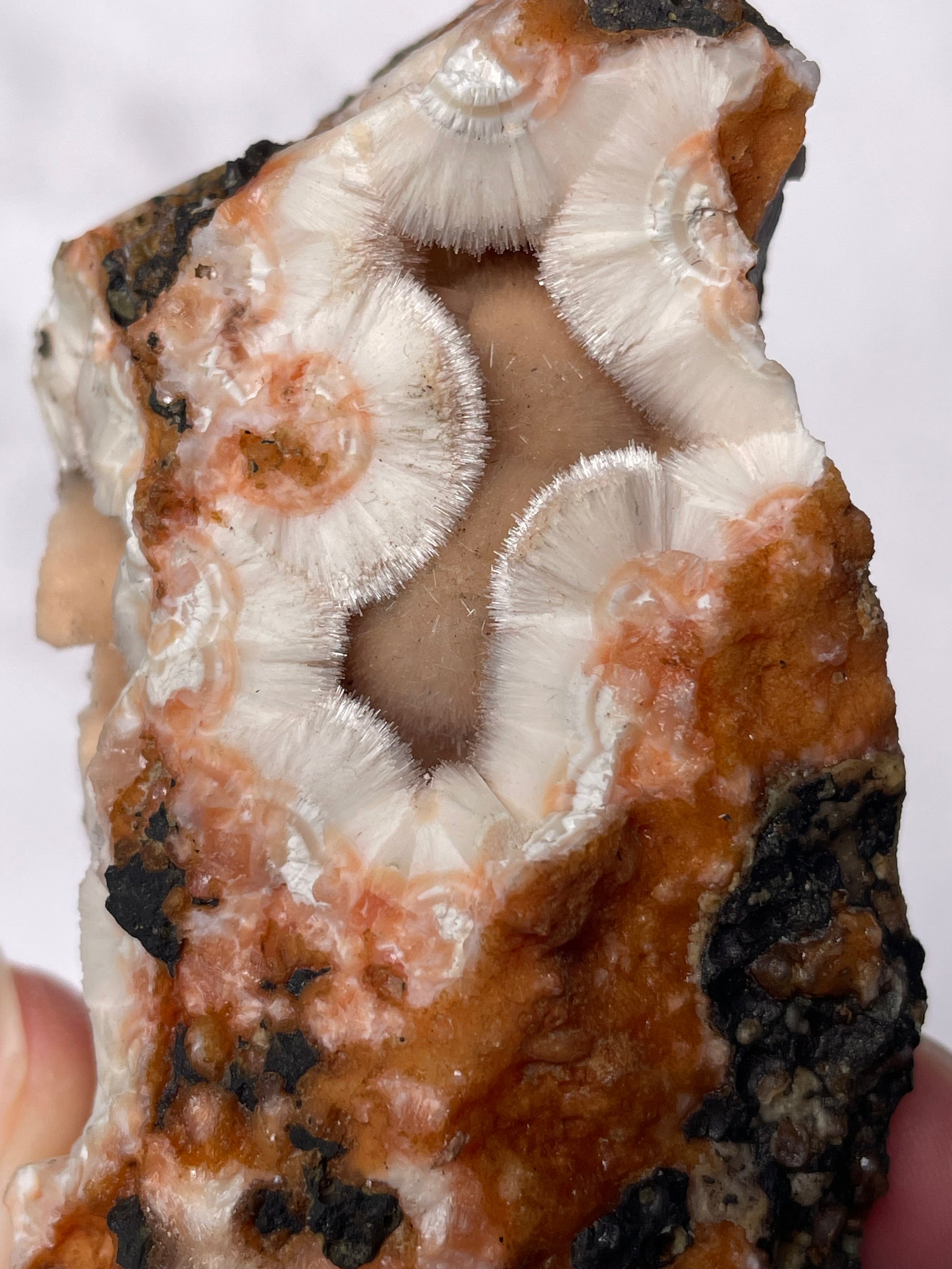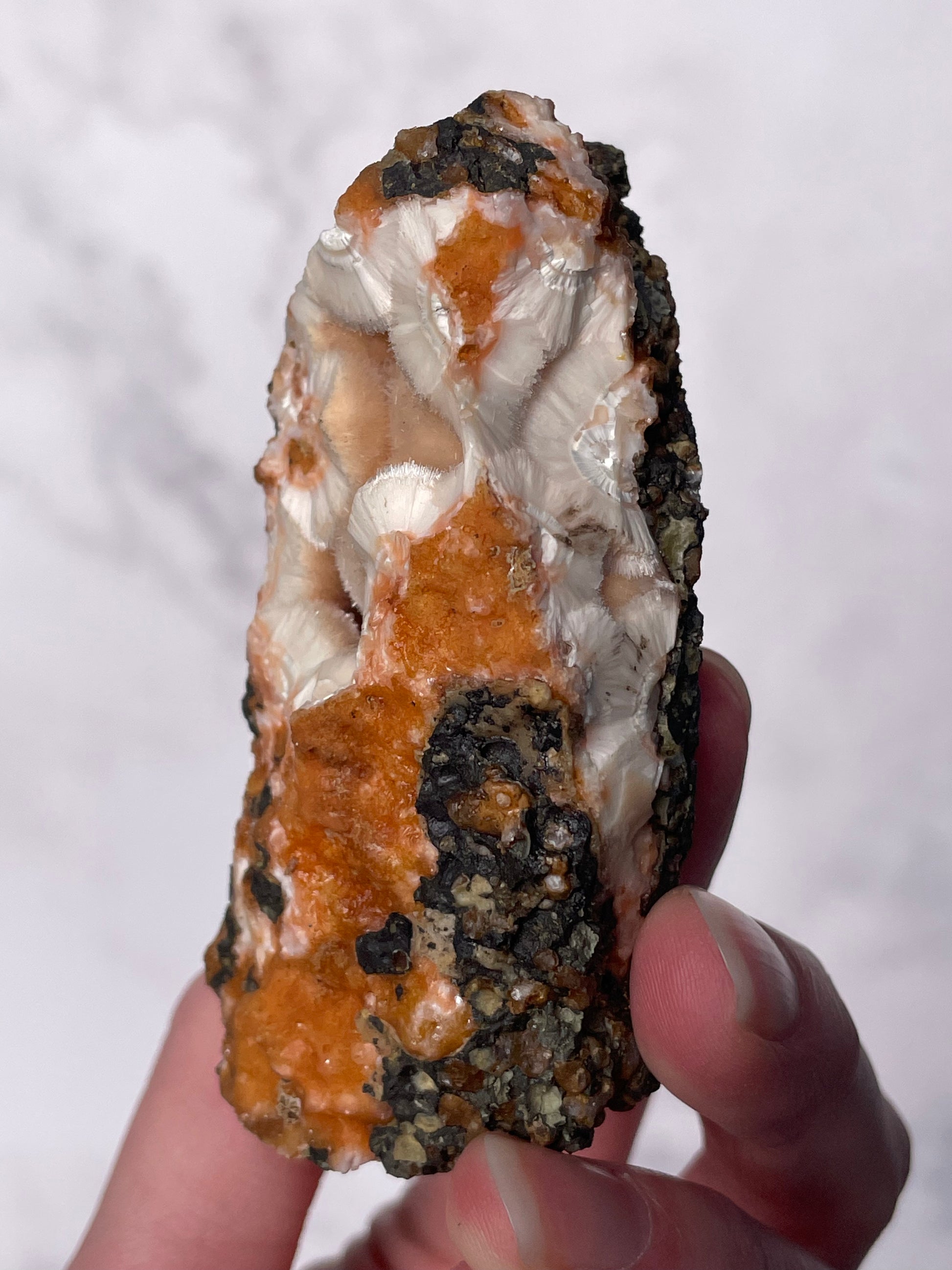 Sourced from India, Orange Thomsonite forms within volcanic basalt alongside other zeolite minerals. Indian Thomsonite is valued for its rarity, grounding energy, and heart-centered healing properties.