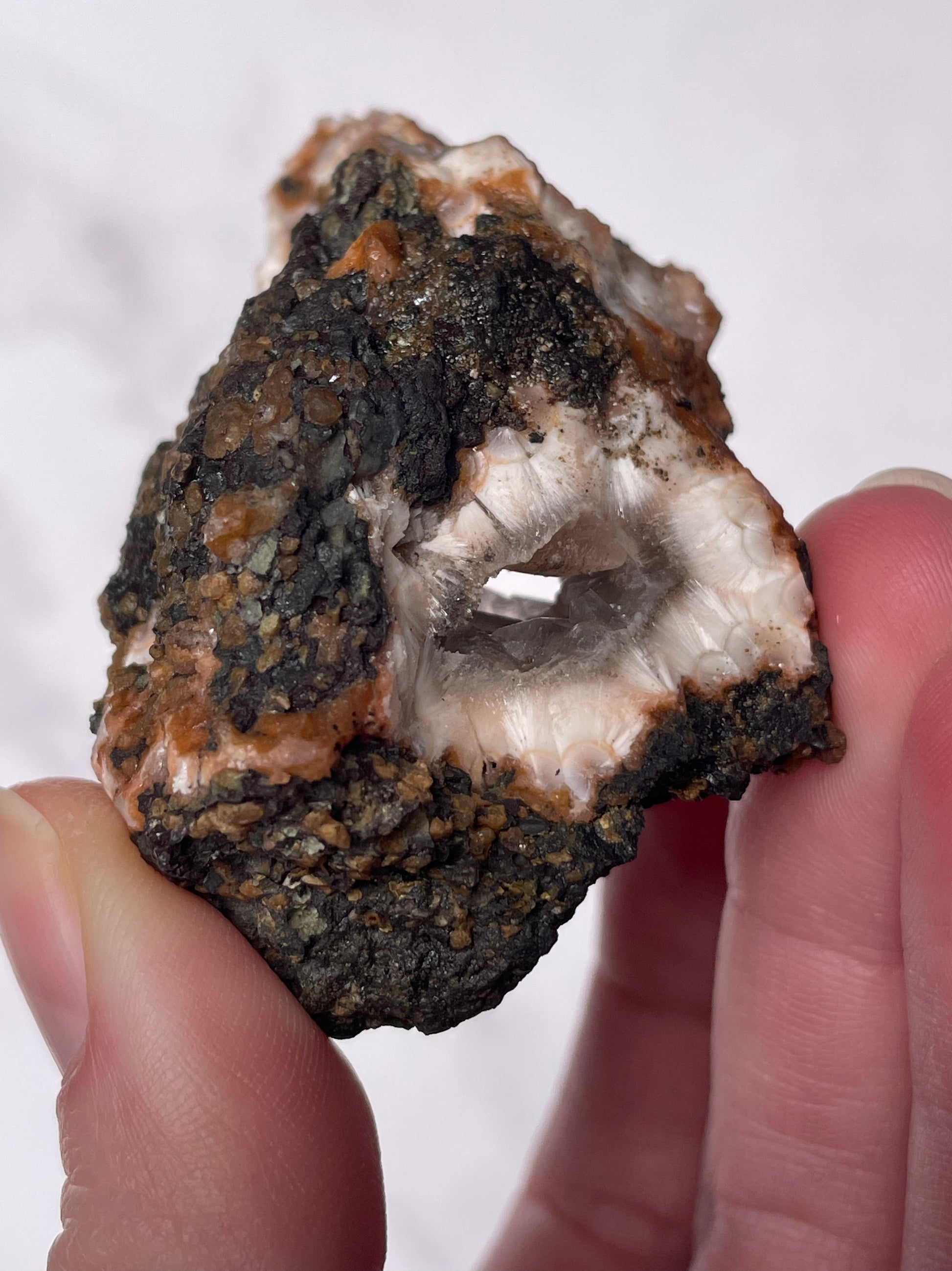 Sourced from India, Orange Thomsonite forms within volcanic basalt alongside other zeolite minerals. Indian Thomsonite is valued for its rarity, grounding energy, and heart-centered healing properties.