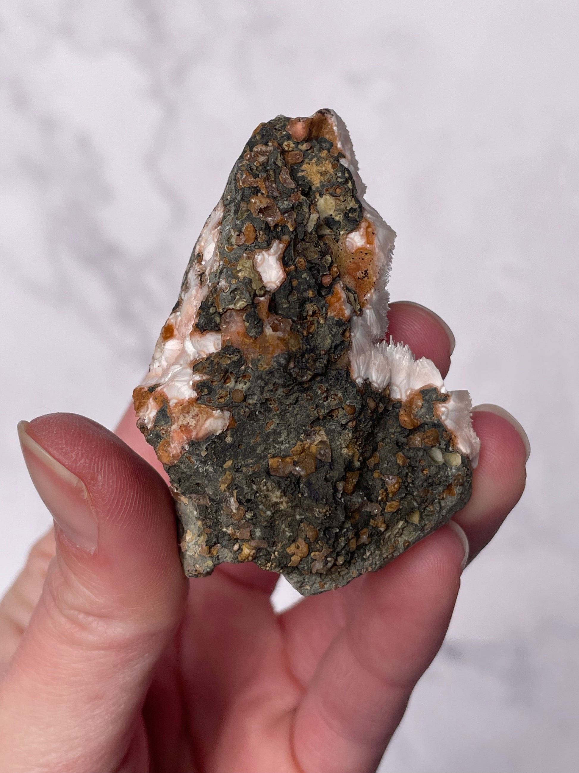 Sourced from India, Orange Thomsonite forms within volcanic basalt alongside other zeolite minerals. Indian Thomsonite is valued for its rarity, grounding energy, and heart-centered healing properties.
