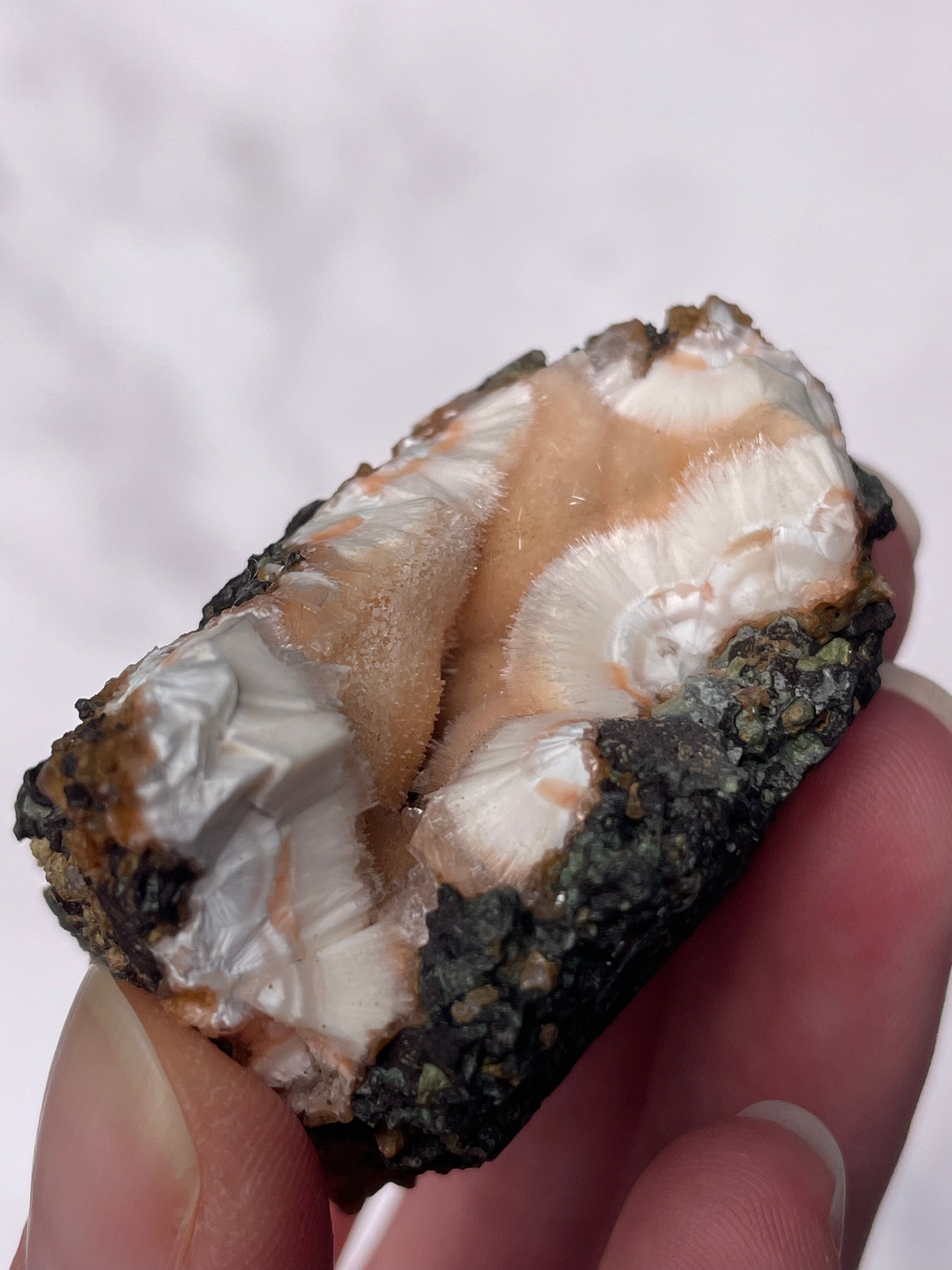 Displays warm peach to orange tones with creamy white zeolite formations. Pieces often show botryoidal textures, soft crystal sprays, and natural matrix contrast, making each specimen visually unique.