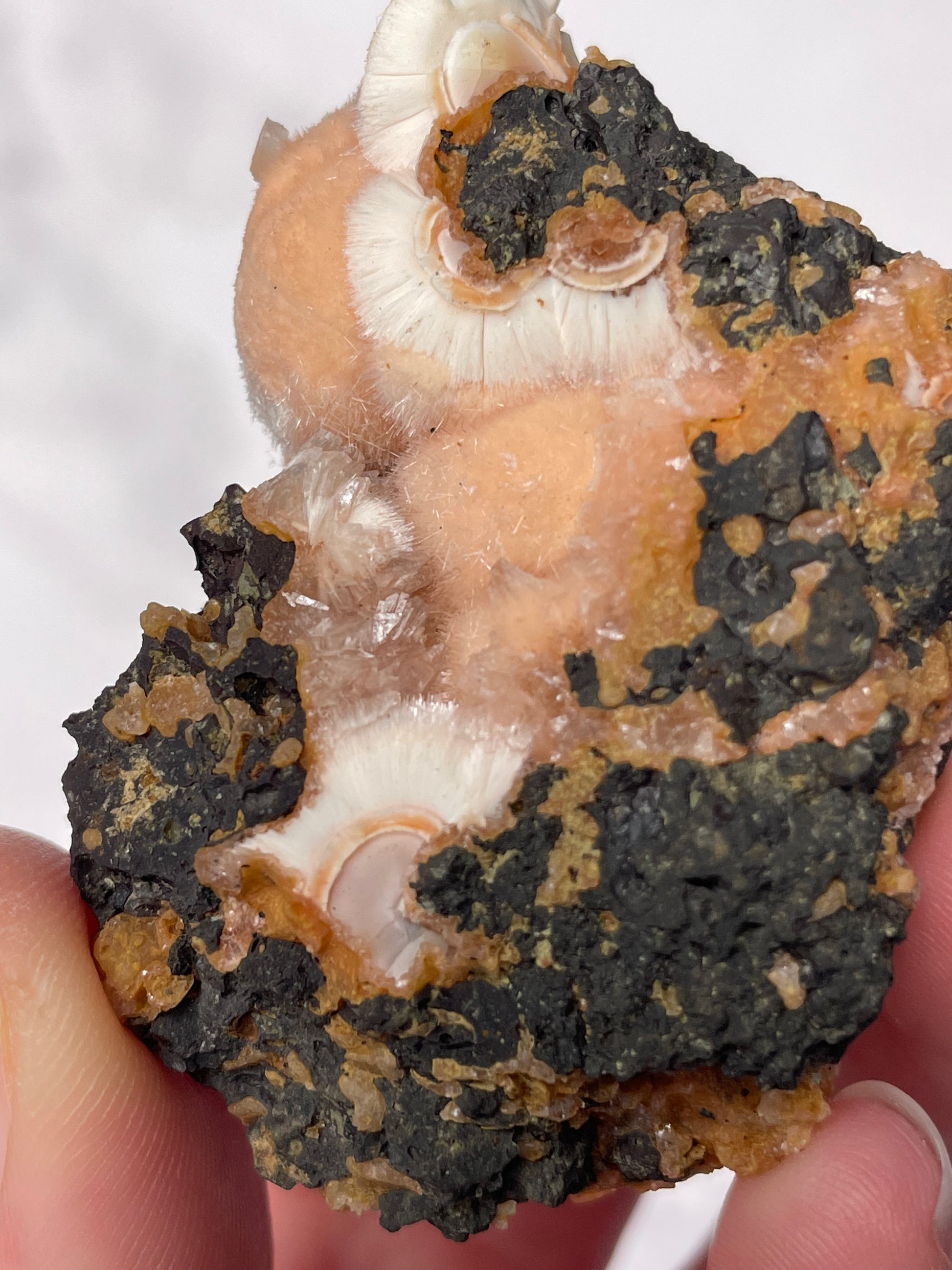 Displays warm peach to orange tones with creamy white zeolite formations. Pieces often show botryoidal textures, soft crystal sprays, and natural matrix contrast, making each specimen visually unique.