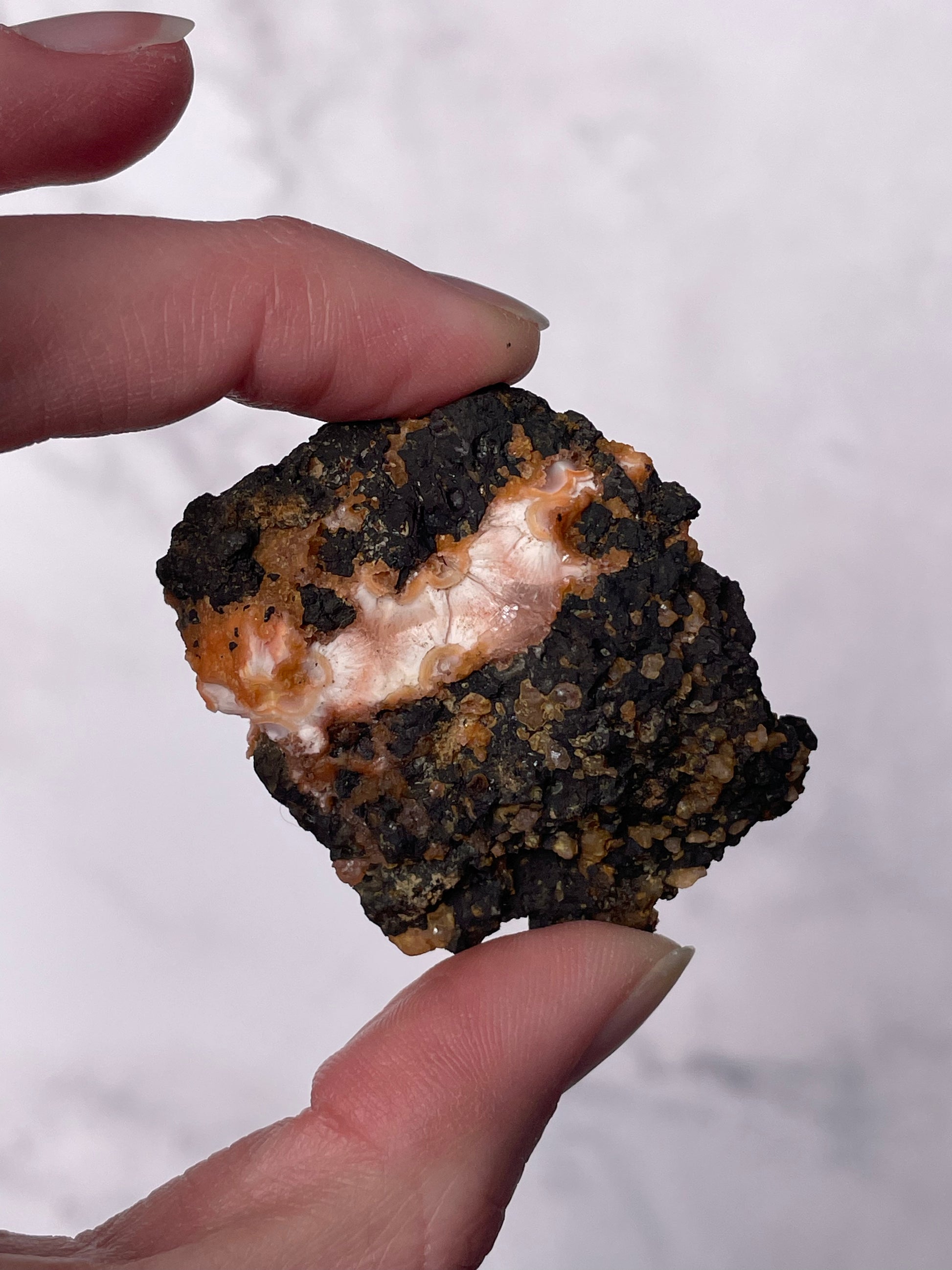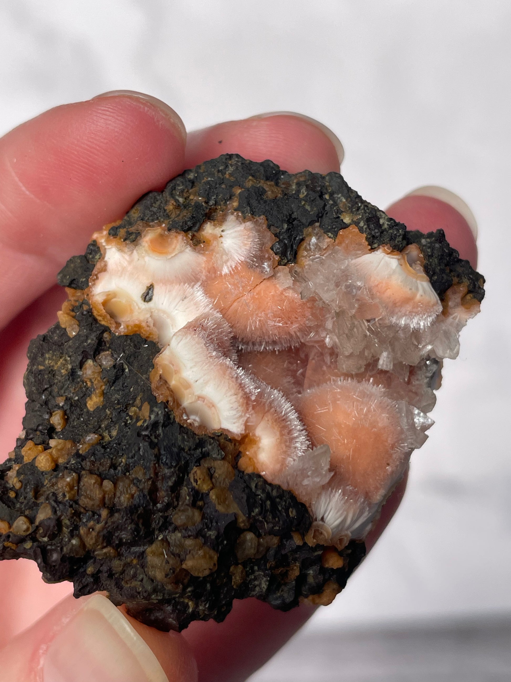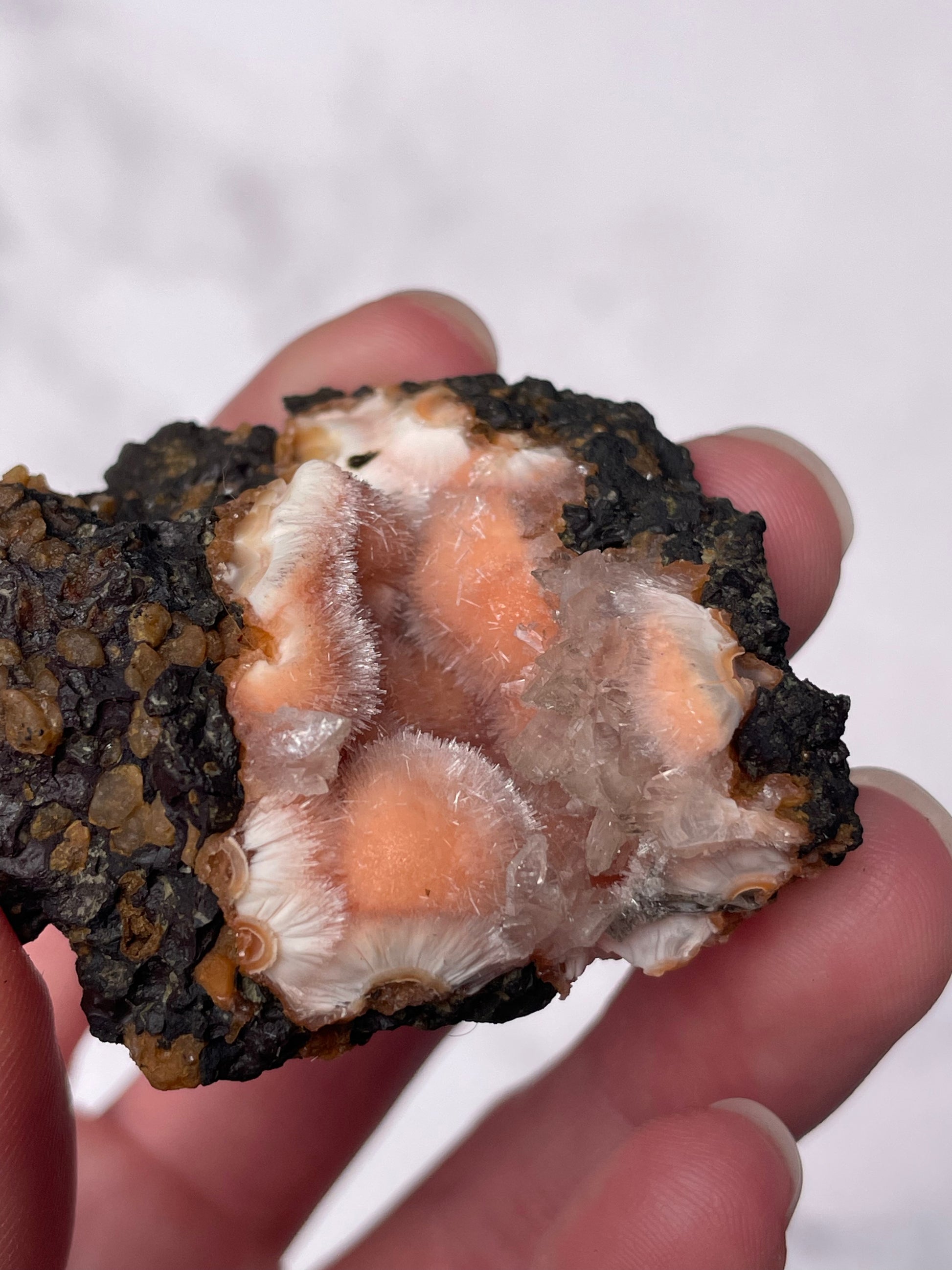 Sourced from India, Orange Thomsonite forms within volcanic basalt alongside other zeolite minerals. Indian Thomsonite is valued for its rarity, grounding energy, and heart-centered healing properties.