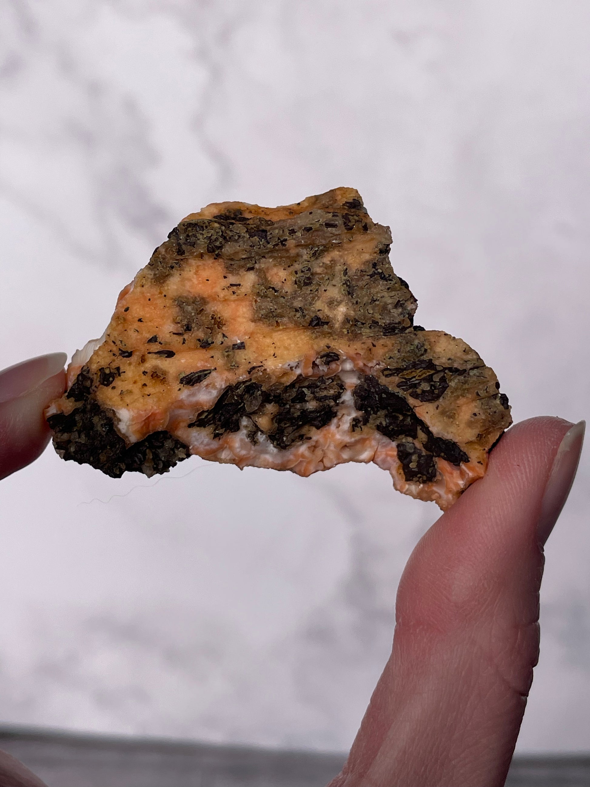 Sourced from India, Orange Thomsonite forms within volcanic basalt alongside other zeolite minerals. Indian Thomsonite is valued for its rarity, grounding energy, and heart-centered healing properties.