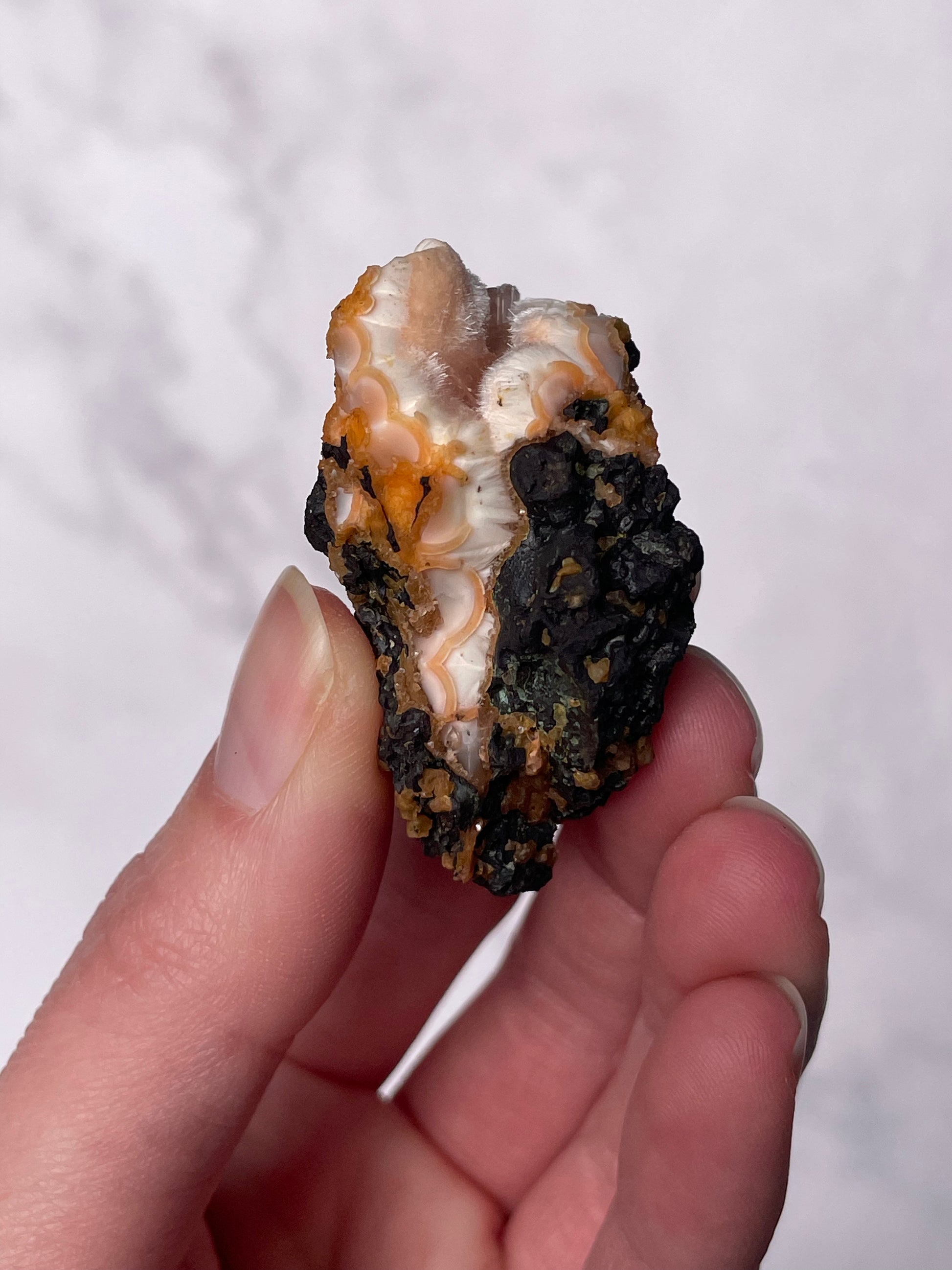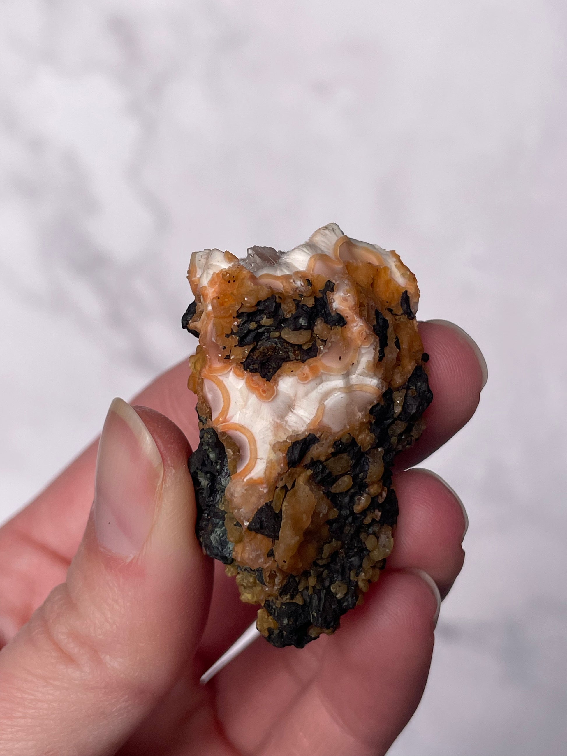 Sourced from India, Orange Thomsonite forms within volcanic basalt alongside other zeolite minerals. Indian Thomsonite is valued for its rarity, grounding energy, and heart-centered healing properties.