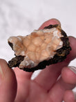 Displays warm peach to orange tones with creamy white zeolite formations. Pieces often show botryoidal textures, soft crystal sprays, and natural matrix contrast, making each specimen visually unique.