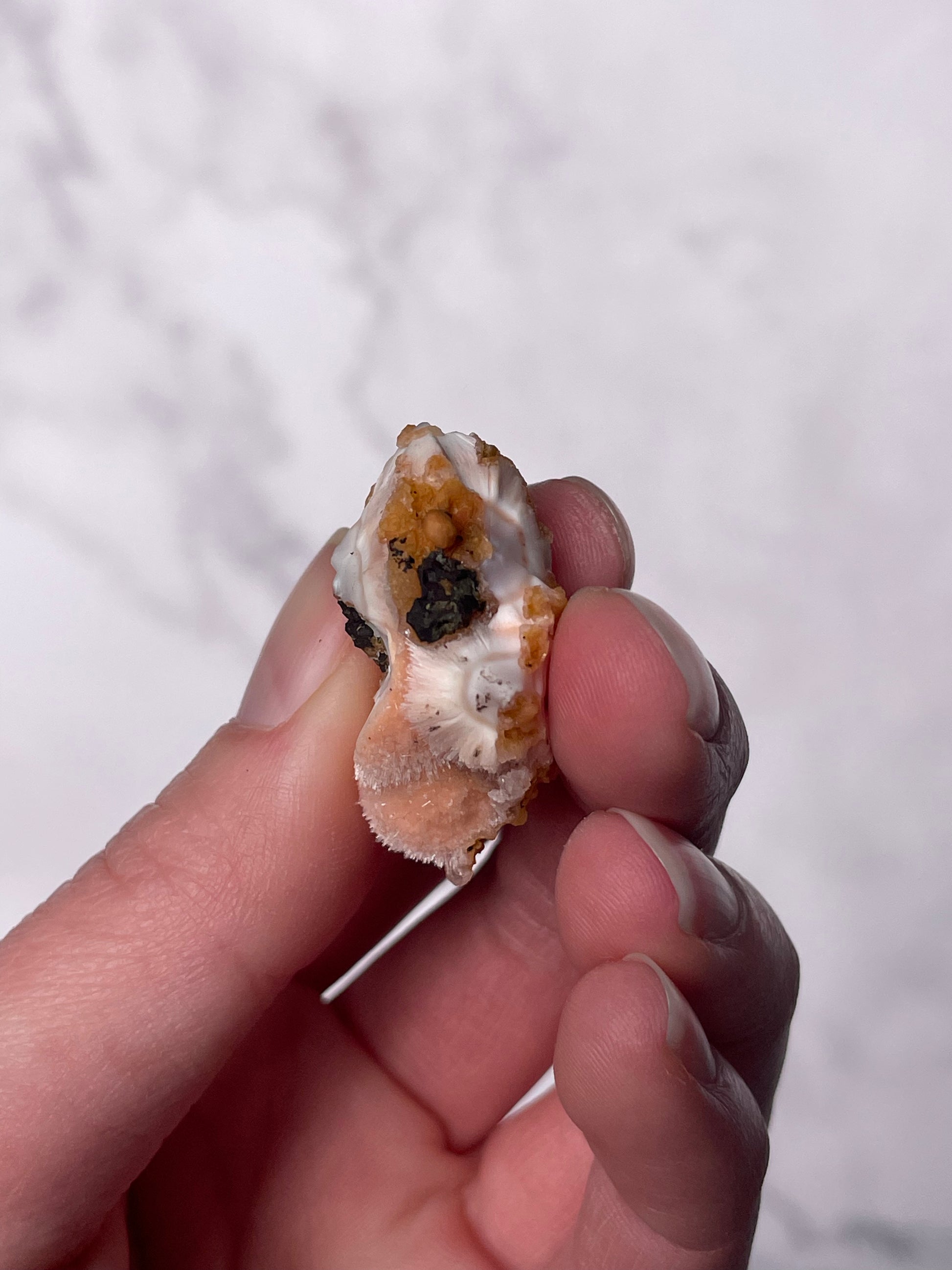 Sourced from India, Orange Thomsonite forms within volcanic basalt alongside other zeolite minerals. Indian Thomsonite is valued for its rarity, grounding energy, and heart-centered healing properties.
