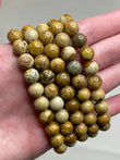 8 mm polished beads in sandy browns, creams, and rust tones with scenic banding.