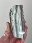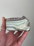 Clean gently with lukewarm water and a soft cloth. Avoid harsh sunlight, which may fade the purple tones. Cleansing methods: recharge under moonlight, place on a selenite plate, or cleanse with palo santo or sound vibration.