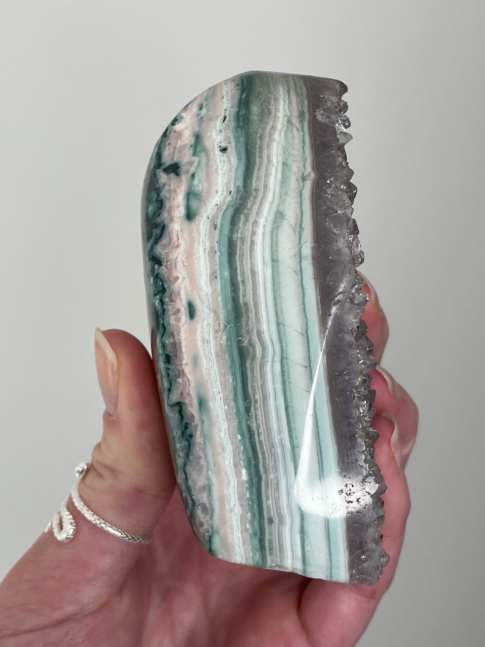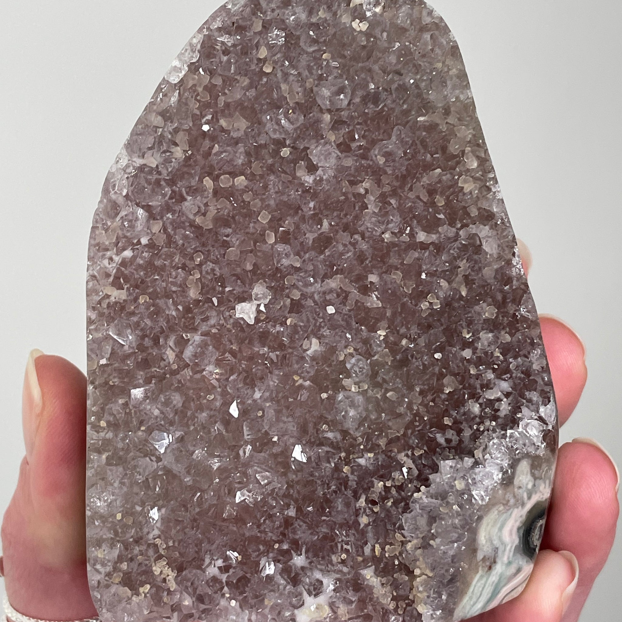 Found in Brazil and other amethyst-rich regions, this unique variety often forms when natural fractures reflect light or when tiny inclusions create an iridescent play of color. Throughout history, amethyst has symbolized wisdom and spiritual clarity, and the rainbow effect amplifies its uplifting energy.