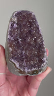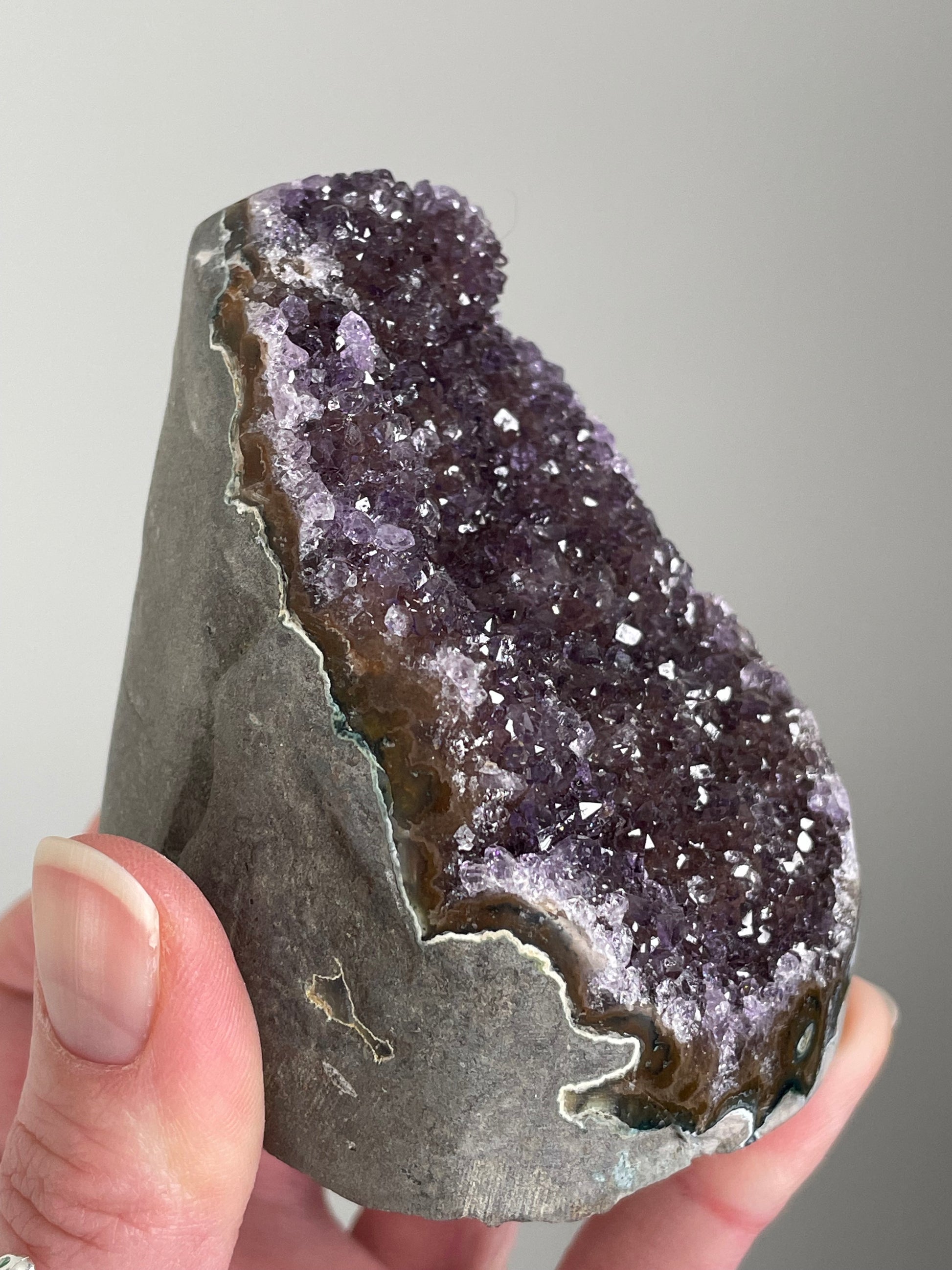 Rainbow Amethyst typically appears as clusters or points in deep violet to lavender shades with shimmering rainbow flashes visible when turned in the light. Each piece is one-of-a-kind with dazzling crystal faces.