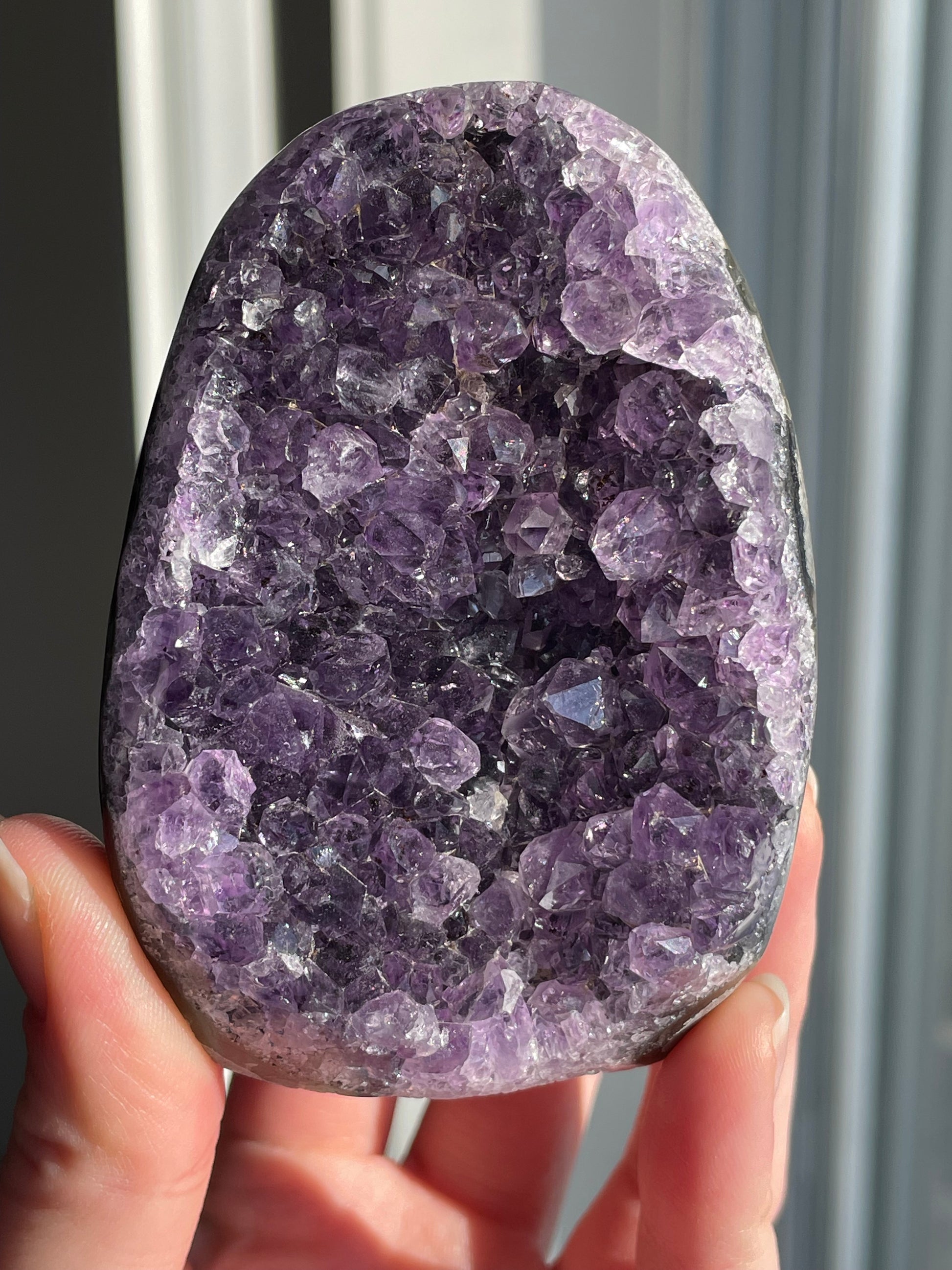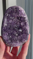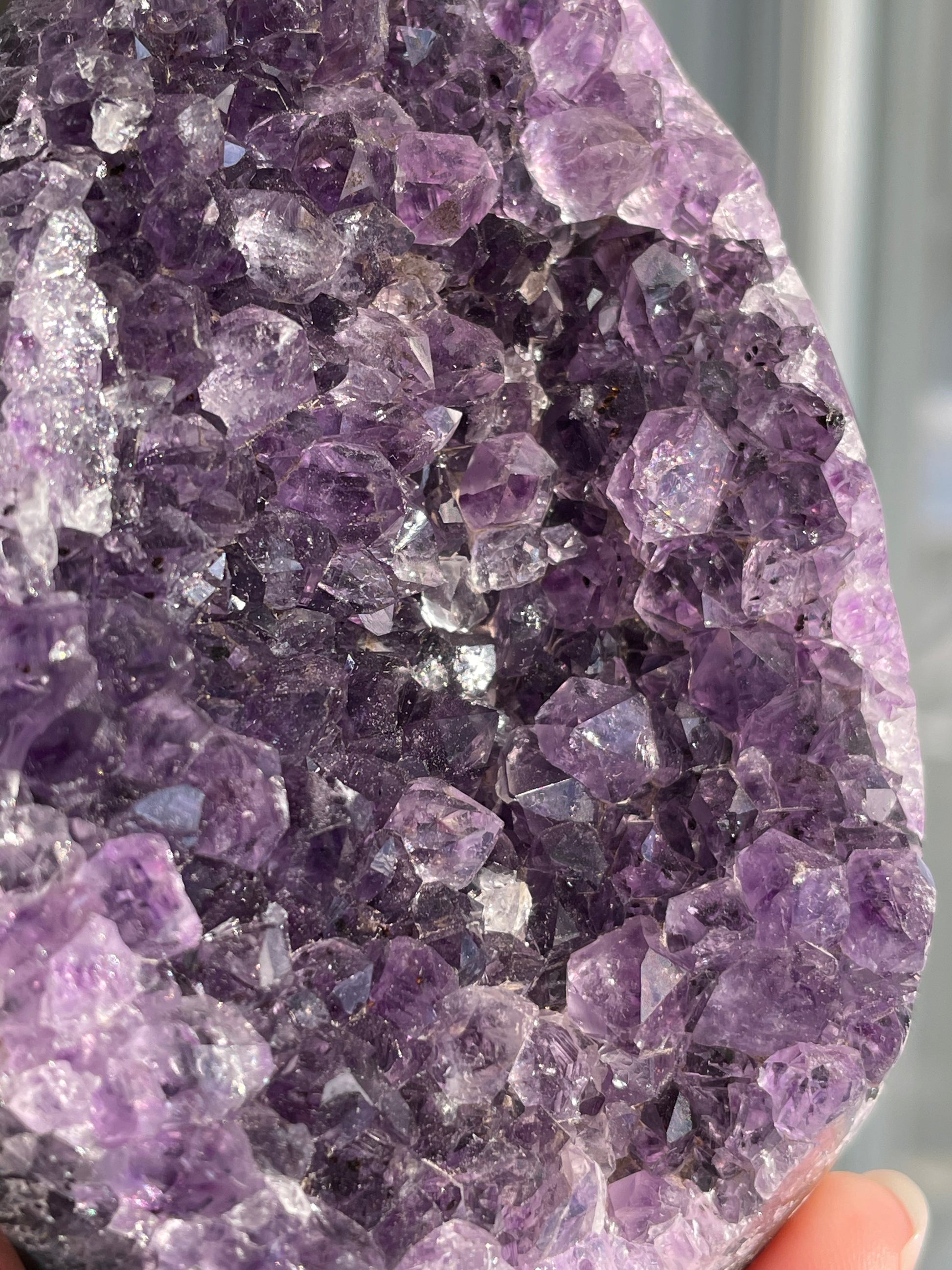 Rainbow Amethyst typically appears as clusters or points in deep violet to lavender shades with shimmering rainbow flashes visible when turned in the light. Each piece is one-of-a-kind with dazzling crystal faces.