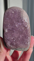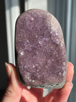 Clean gently with lukewarm water and a soft cloth. Avoid harsh sunlight, which may fade the purple tones. Cleansing methods: recharge under moonlight, place on a selenite plate, or cleanse with palo santo or sound vibration.