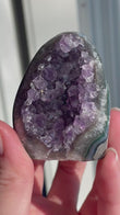 Rainbow Amethyst typically appears as clusters or points in deep violet to lavender shades with shimmering rainbow flashes visible when turned in the light. Each piece is one-of-a-kind with dazzling crystal faces.