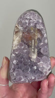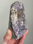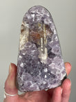 Rainbow Amethyst typically appears as clusters or points in deep violet to lavender shades with shimmering rainbow flashes visible when turned in the light. Each piece is one-of-a-kind with dazzling crystal faces.