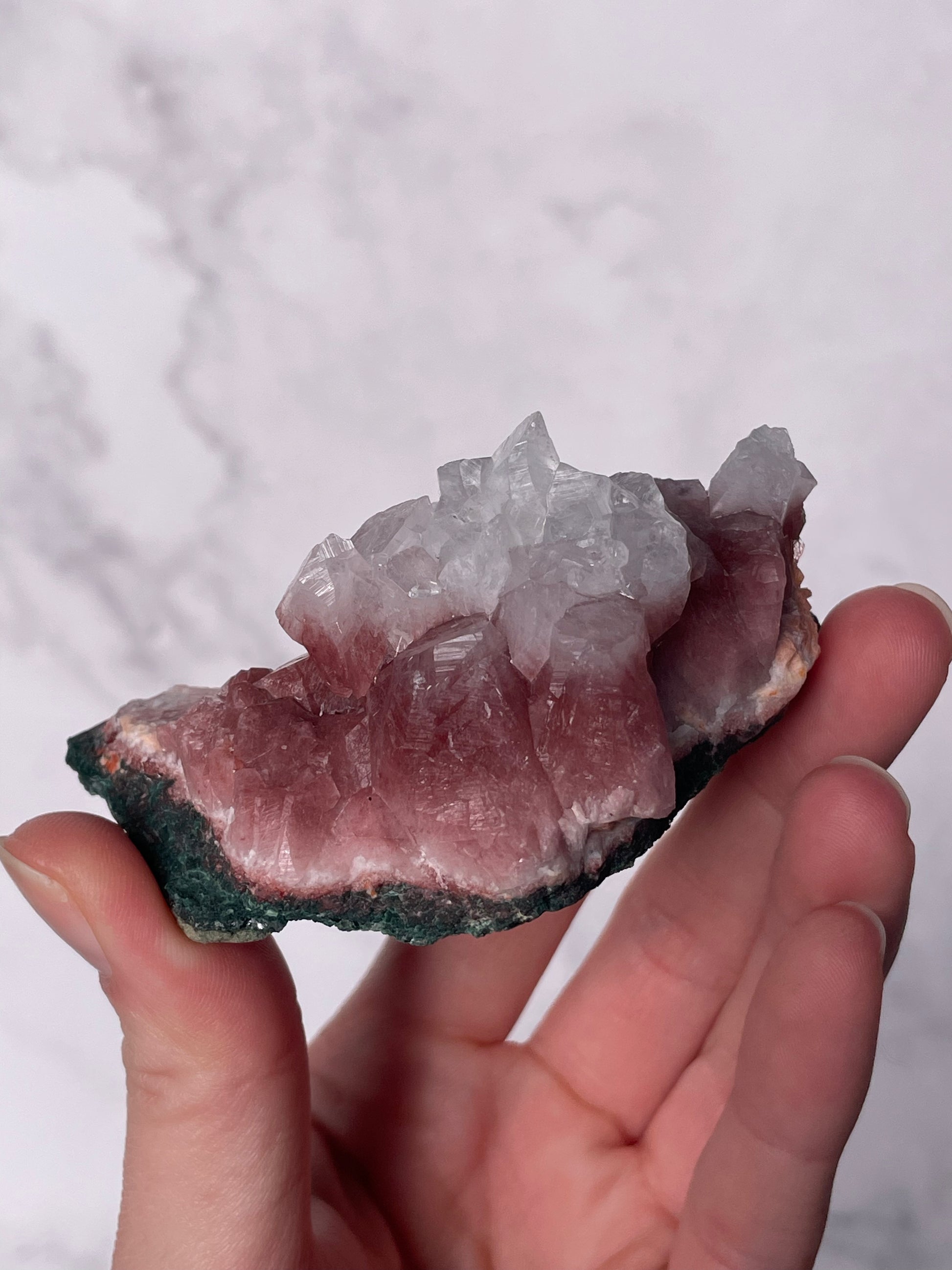 Sourced from India, Red Apophyllite forms within basalt matrix alongside other zeolite minerals. Indian Apophyllite is highly regarded for its exceptional crystal structure and strong energetic resonance, especially in heart and root chakra work.
