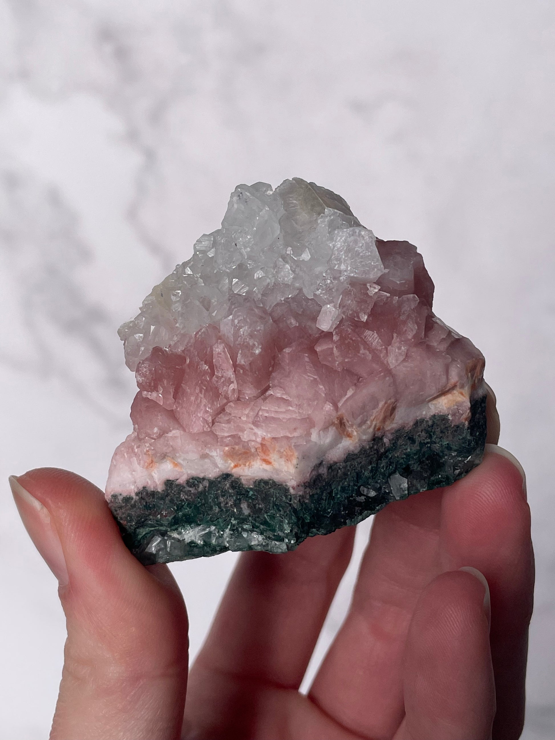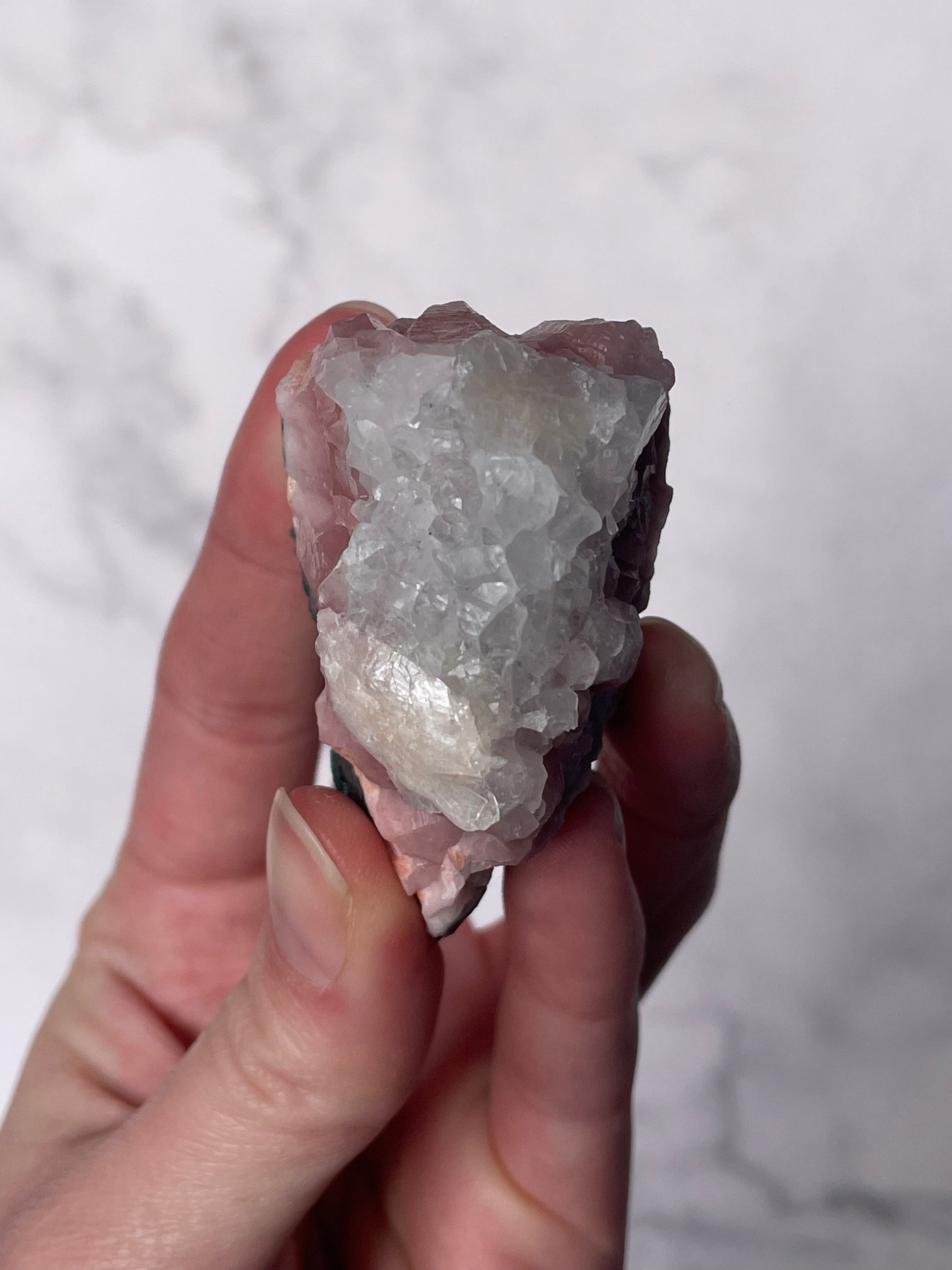 Handle gently, as Apophyllite is delicate and water-sensitive. Avoid soaking or harsh chemicals.
