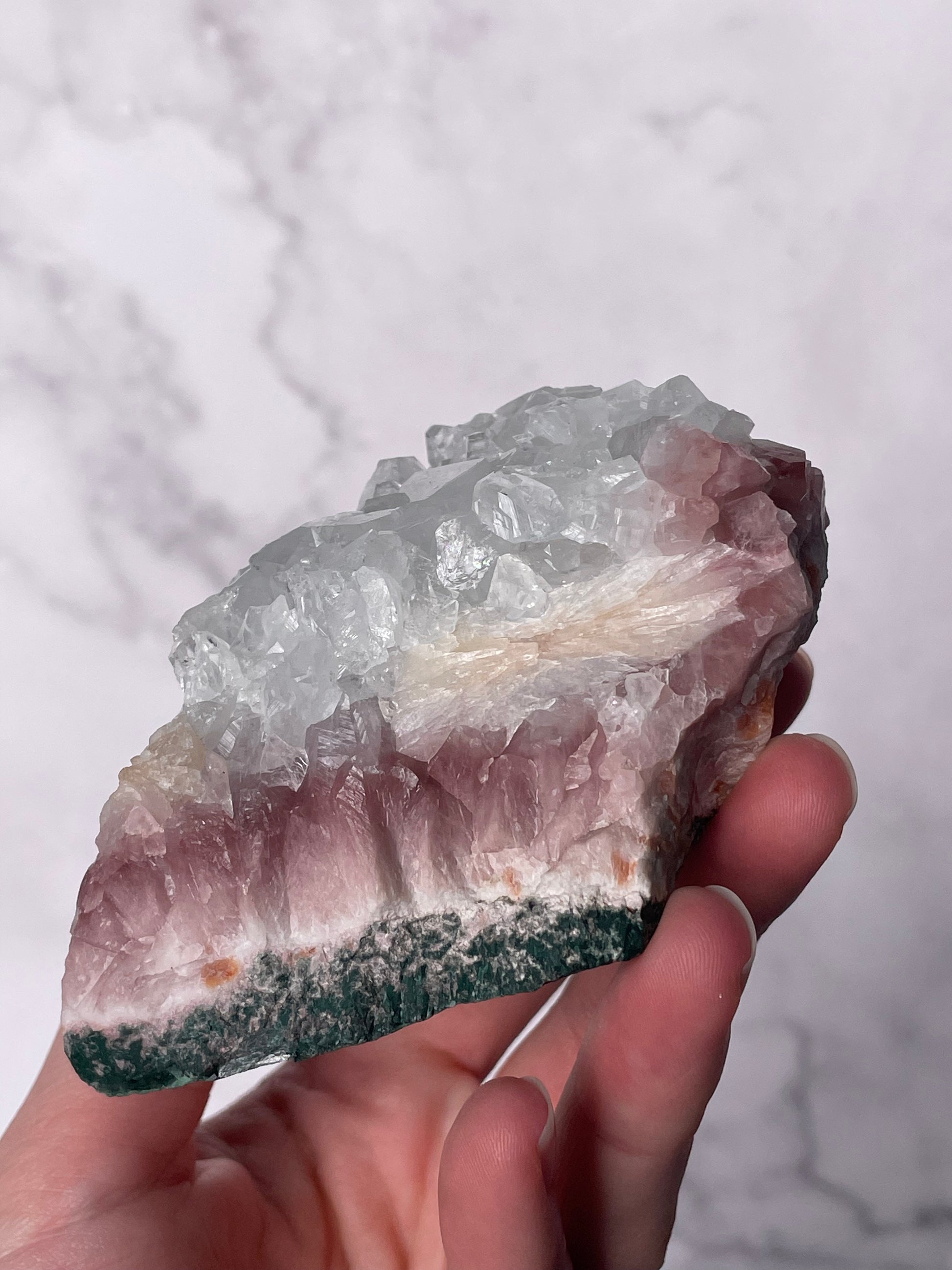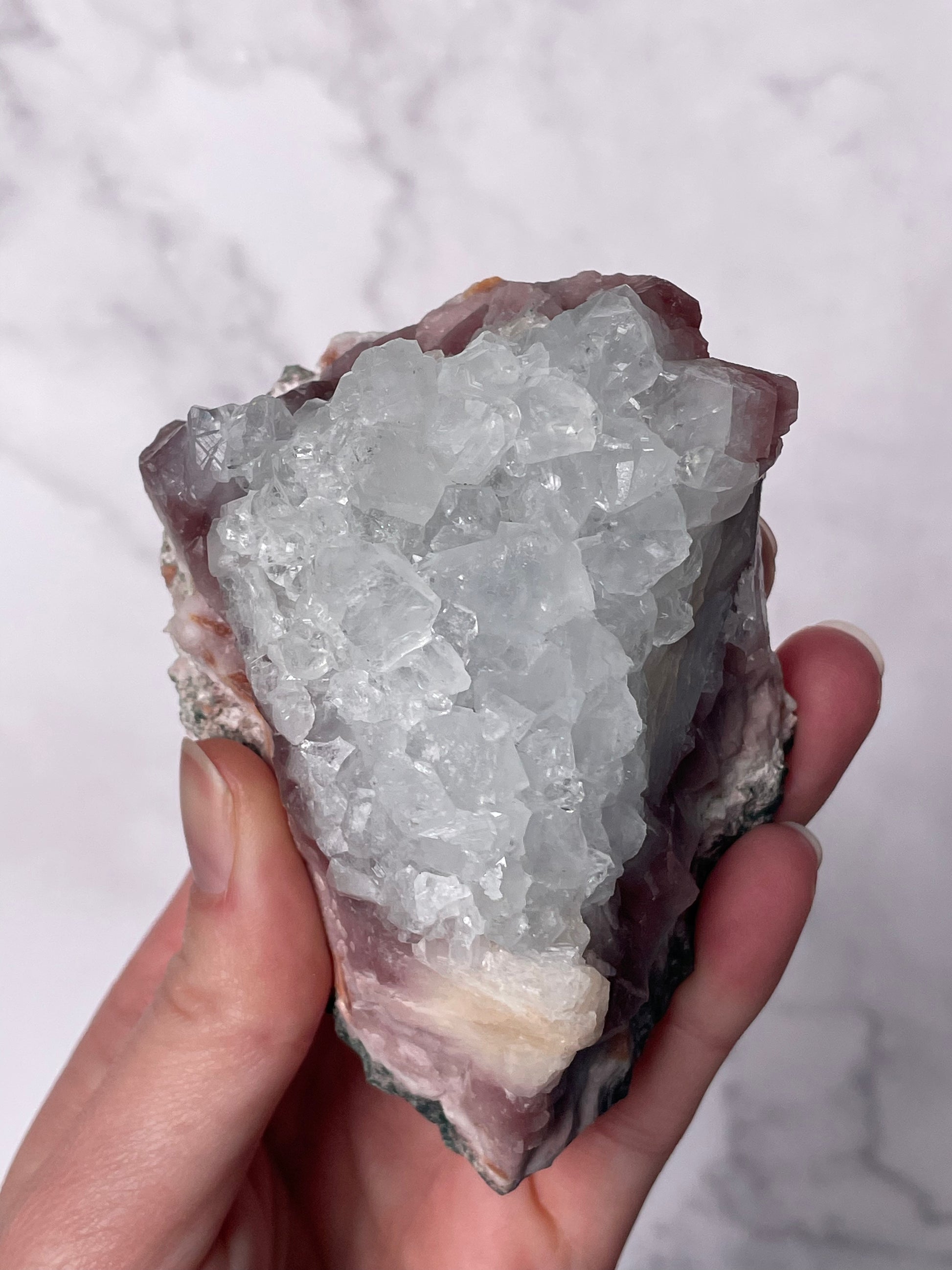 Sourced from India, Red Apophyllite forms within basalt matrix alongside other zeolite minerals. Indian Apophyllite is highly regarded for its exceptional crystal structure and strong energetic resonance, especially in heart and root chakra work.