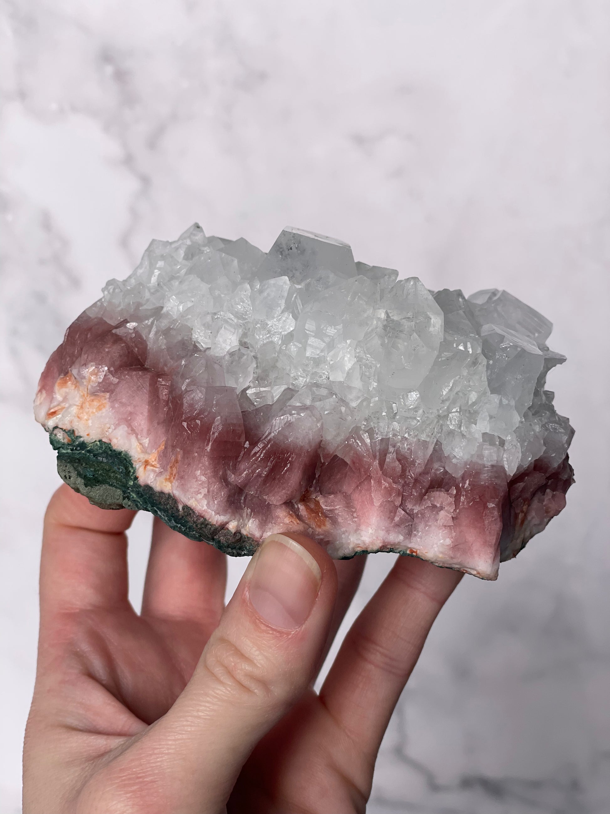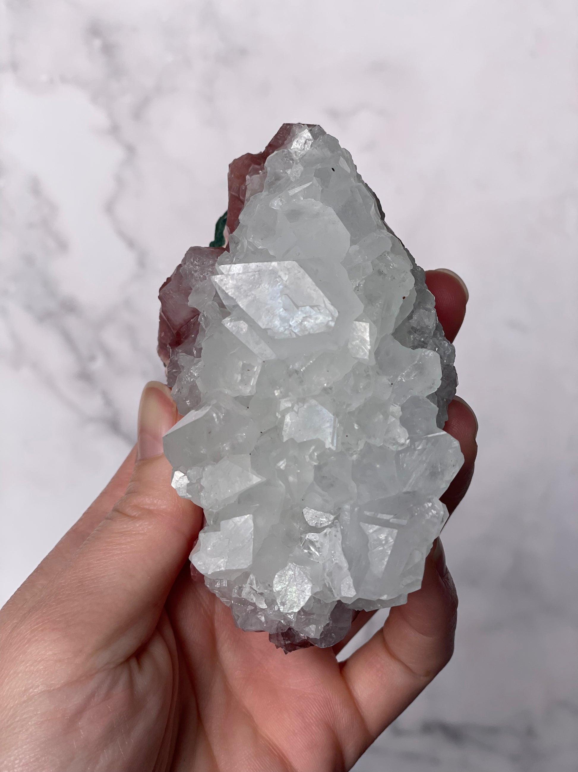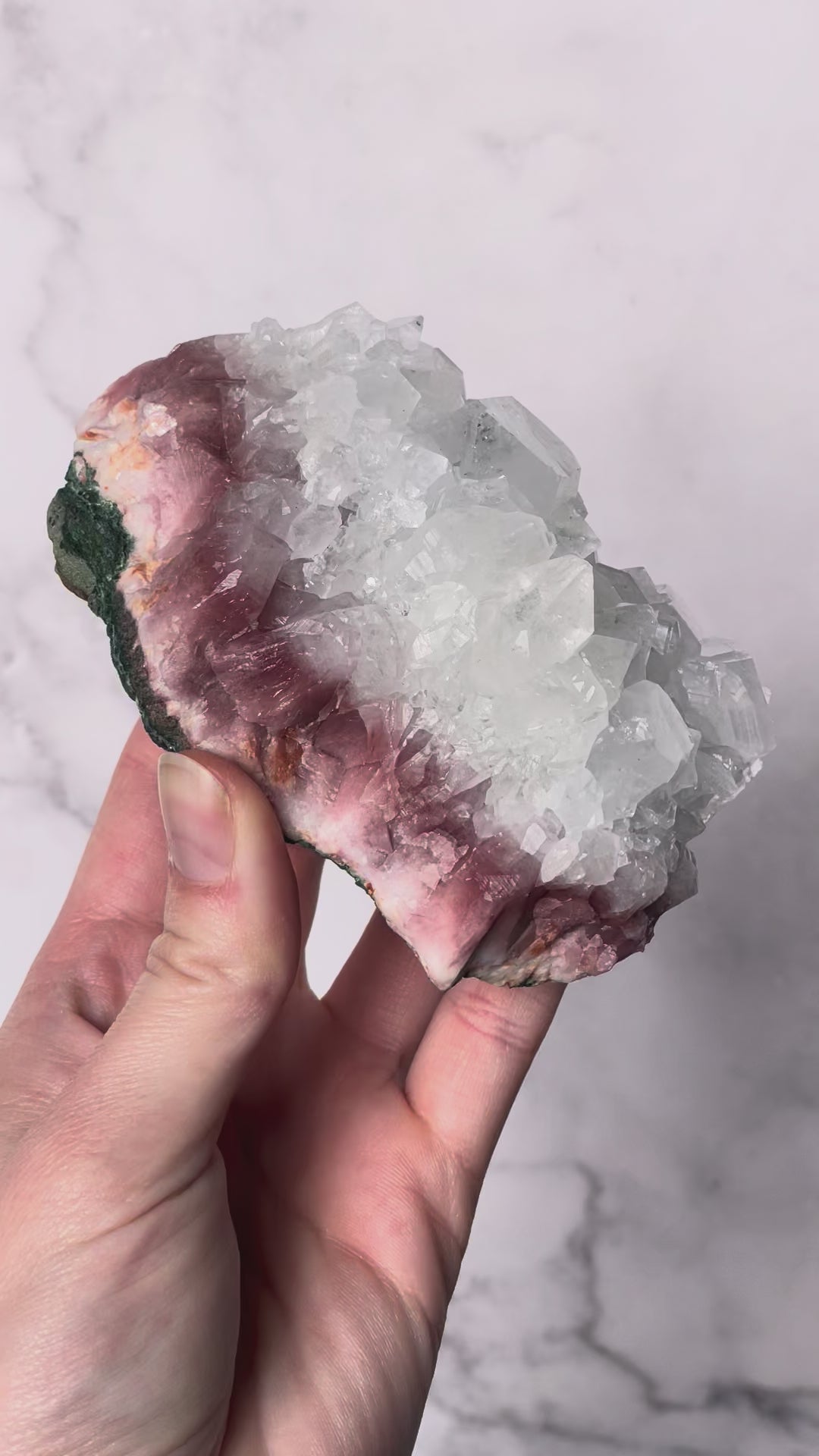 Sourced from India, Red Apophyllite forms within basalt matrix alongside other zeolite minerals. Indian Apophyllite is highly regarded for its exceptional crystal structure and strong energetic resonance, especially in heart and root chakra work.