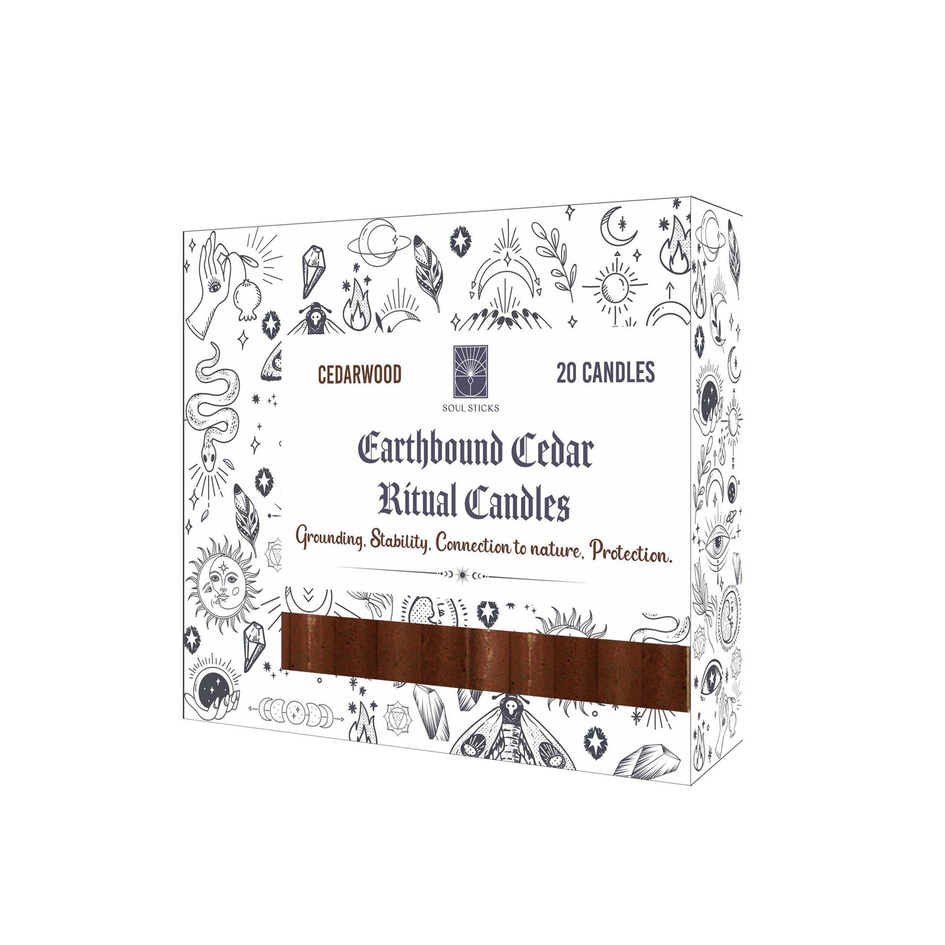 (Soul Sticks) Earthbound Cedarwood Ritual Candles Pack of 20, Burn Time: 2-2.5 hrs each Experience the allure of tranquility and the power of intention with our Scented Ritual Candles - a collection meticulously designed to elevate your personal ceremonies and create the ultimate ambience for relaxation and reflection. Each candle is a blend of harmony and purpose, crafted with an exclusive mix of premium-quality waxes and infused with a unique ensemble of essential oils, chosen not only for their enchanting fragrances but also for their therapeutic properties that encourage mental clarity, emotional balance, and spiritual awakening. Crafted to the highest standards of craftsmanship, these candles are made from premium, sustainable wax that ensures a long-lasting and steady flame.