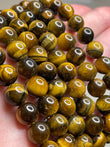 Golden to brown chatoyant bands (cat’s-eye effect) in polished 8 mm beads. The shimmering band shifts as you move it.