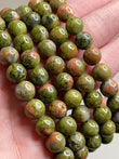 Polished 8 mm beads with mottled green and pink tones in earthy patterns.
